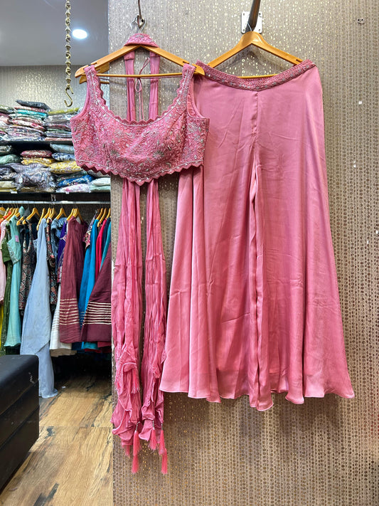 Kalpana’s Creations presents a dESIGNER Chinon Handwork Ensemble, featuring a spaghetti blouse, palazzo pants, and...