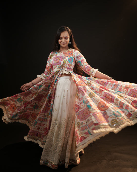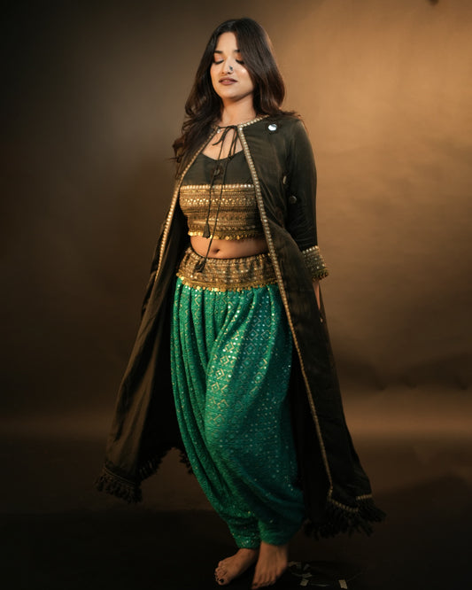 Kalpana’s Creations presents a dESIGNER Long Mirror Work Shrug Set, a stunning fusion of heritage...