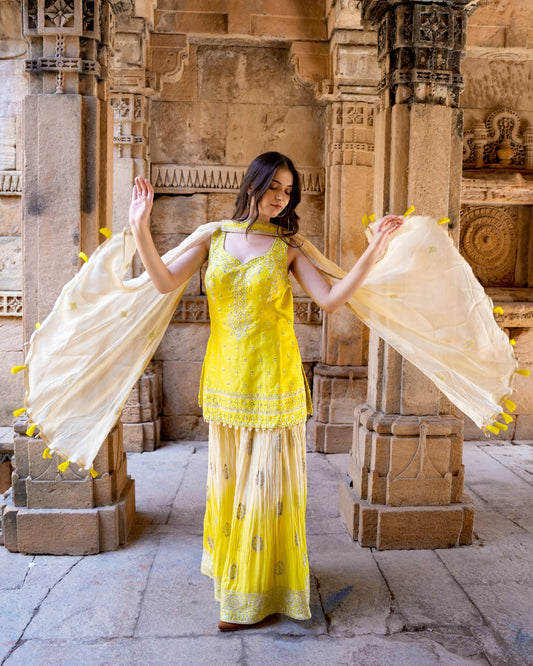 Kalpana’s Creations introduces a stunning designer Indo-Western ensemble featuring a long cape-style jacket paired with...