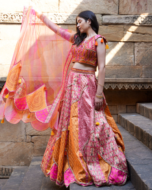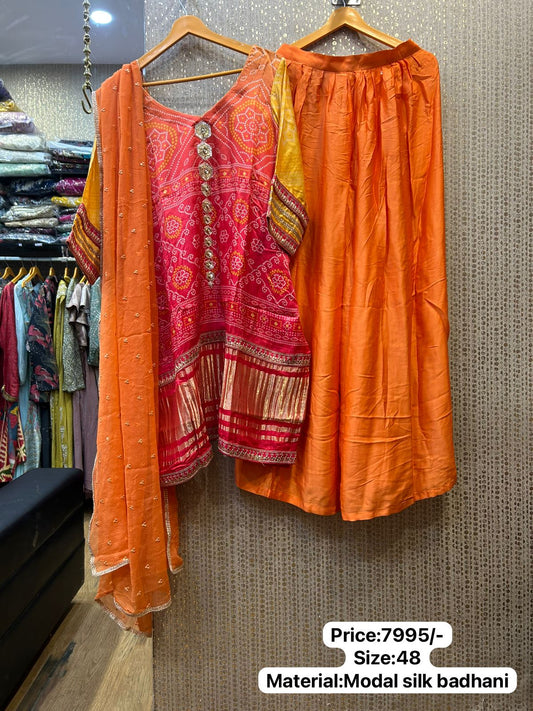 Kalpana’s Creations presents a stunning DESIGNER ensemble featuring an orange modal silk Bandhani dress, paired...
