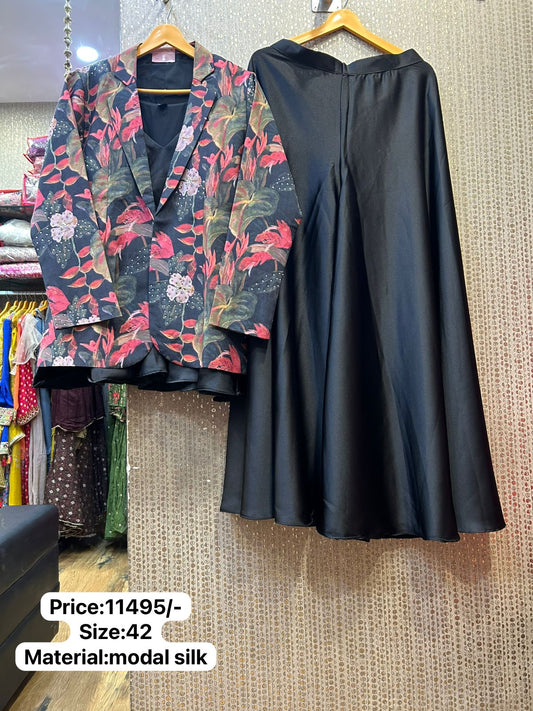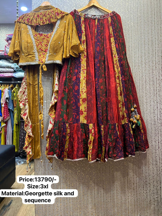 Kalpana’s Creations introduces a stunning designer Indo-Western ensemble featuring an abstract multi-print georgette chaniya, a...
