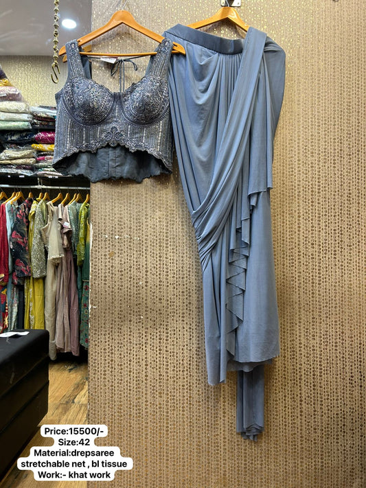 Kalpana’s Creations showcases a stunning DESIGNER Indo-Western grey drape saree crafted from stretchable net, beautifully...