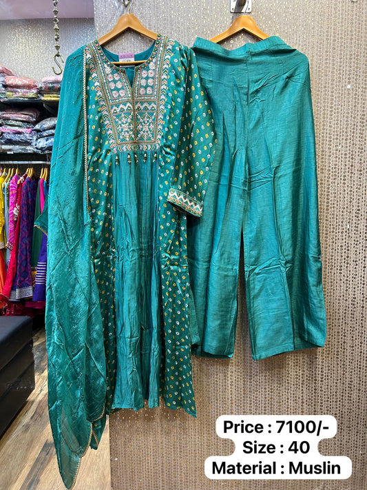 Kalpana’s Creations presents a stunning DESIGNER ensemble featuring a muslin dress, heavy pants, and a...