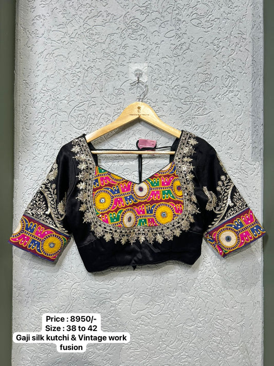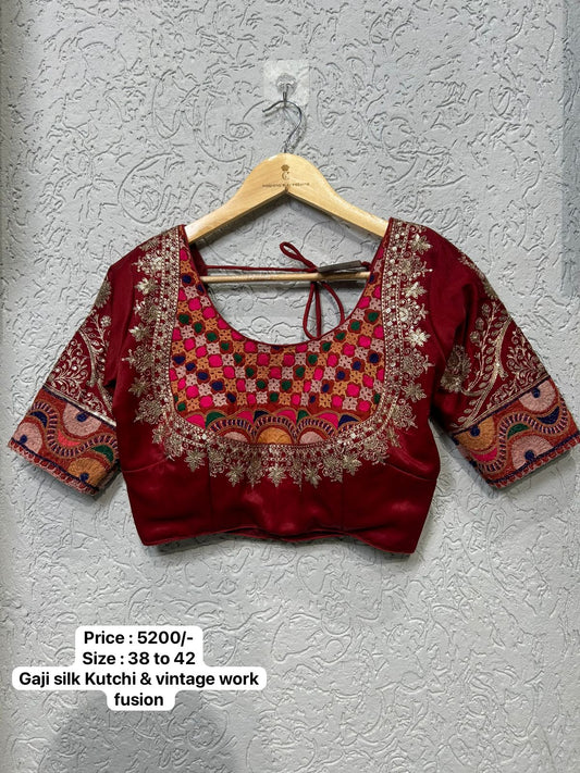 Kalpana’s Creations presents a dESIGNER Gaji Silk Fancy Blouse featuring intricate Kutchi vintage work, curated...