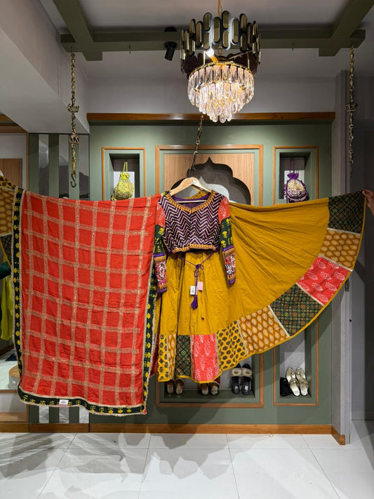 Designer Cotton Bandhani Chaniya, Kutchi Work Corset Blouse & Jorzet Tikki Work Dupatta SetBy Kalpanas...