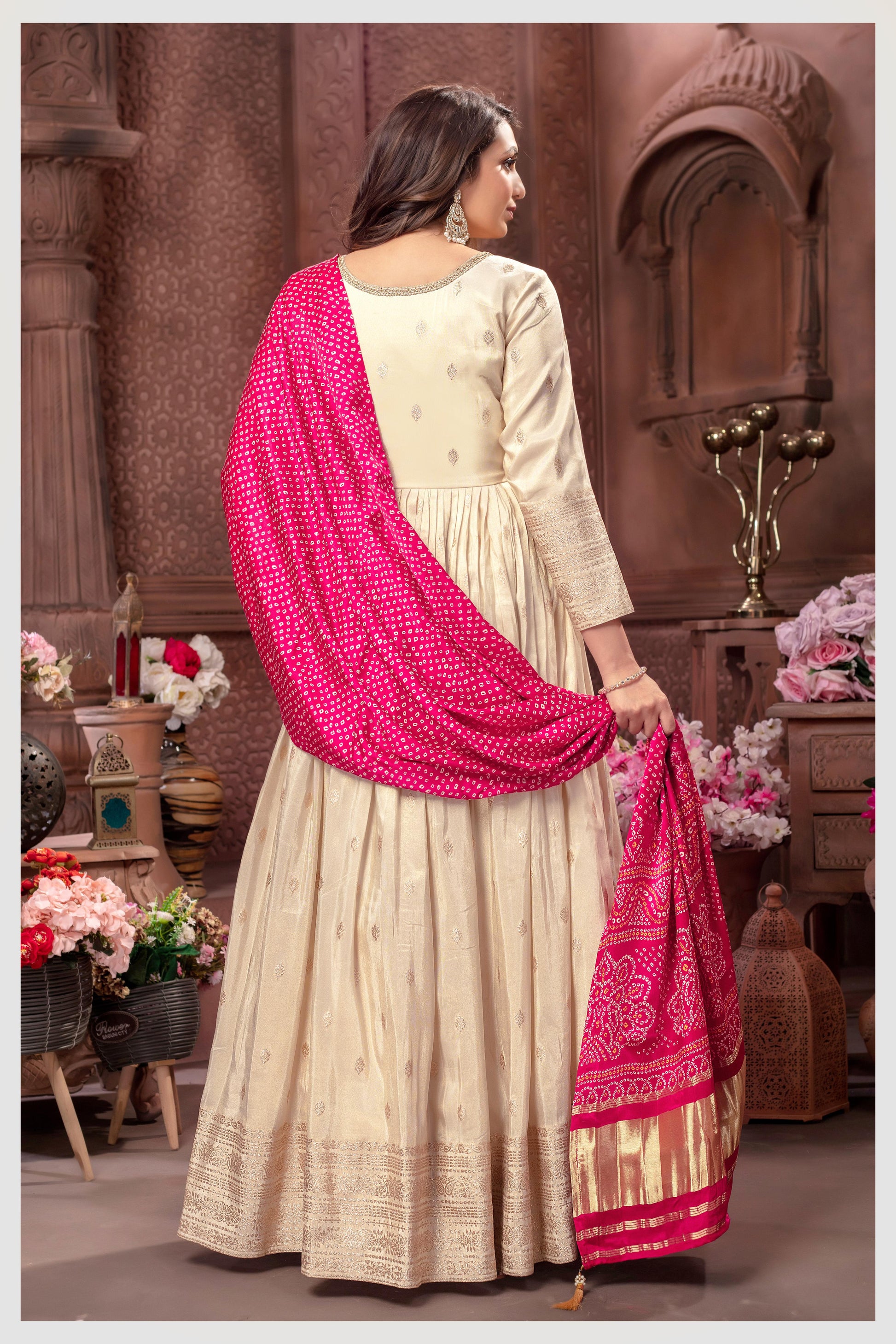 Embrace the allure of our cream silk anarkali suit and exude confidence and grace at any event. With its classic silhouette and impeccable craftsmanship, this ensemble promises to make you feel radiant and effortlessly stylish, capturing attention with its understated sophistication.