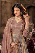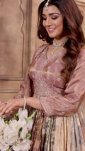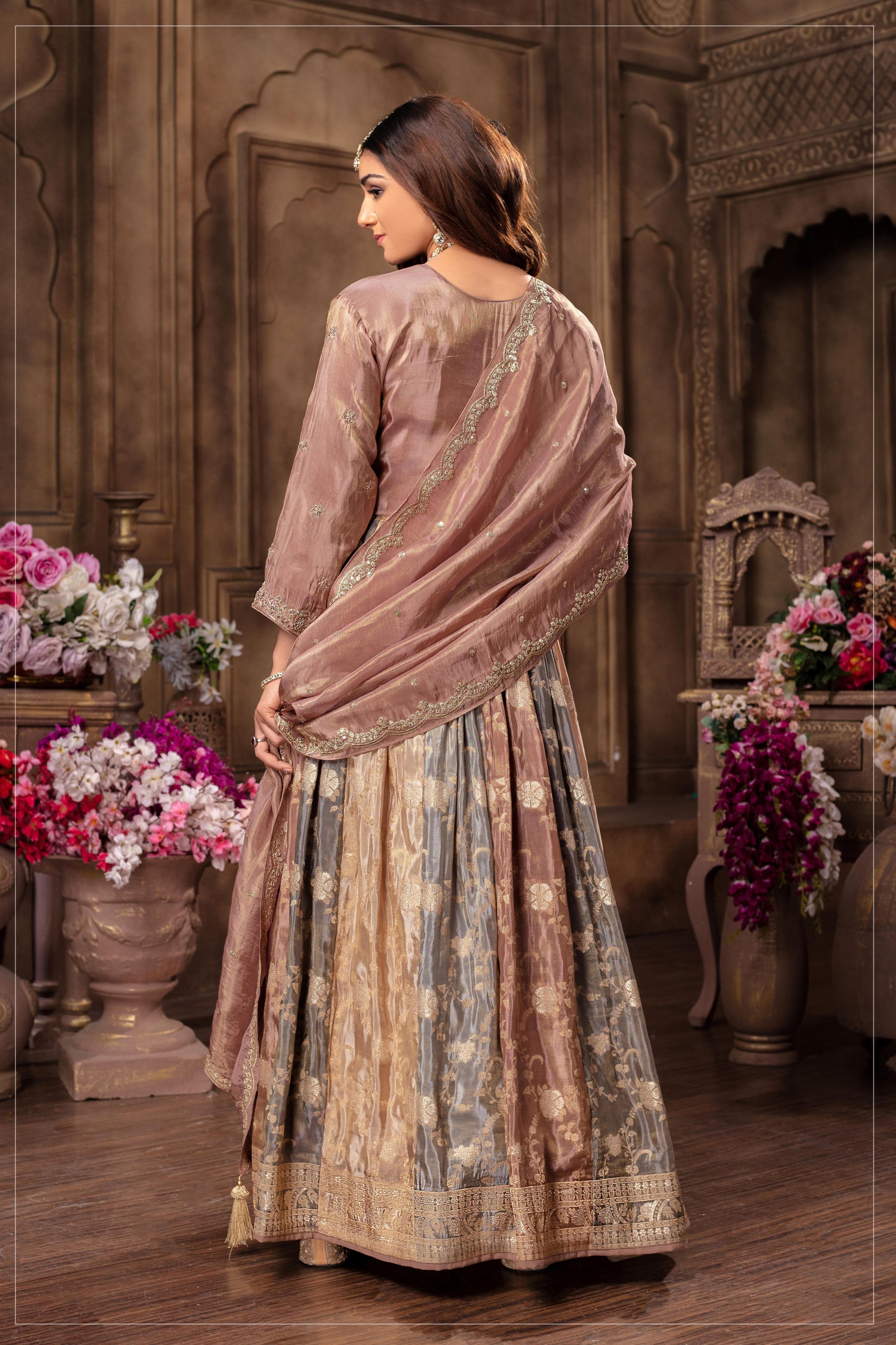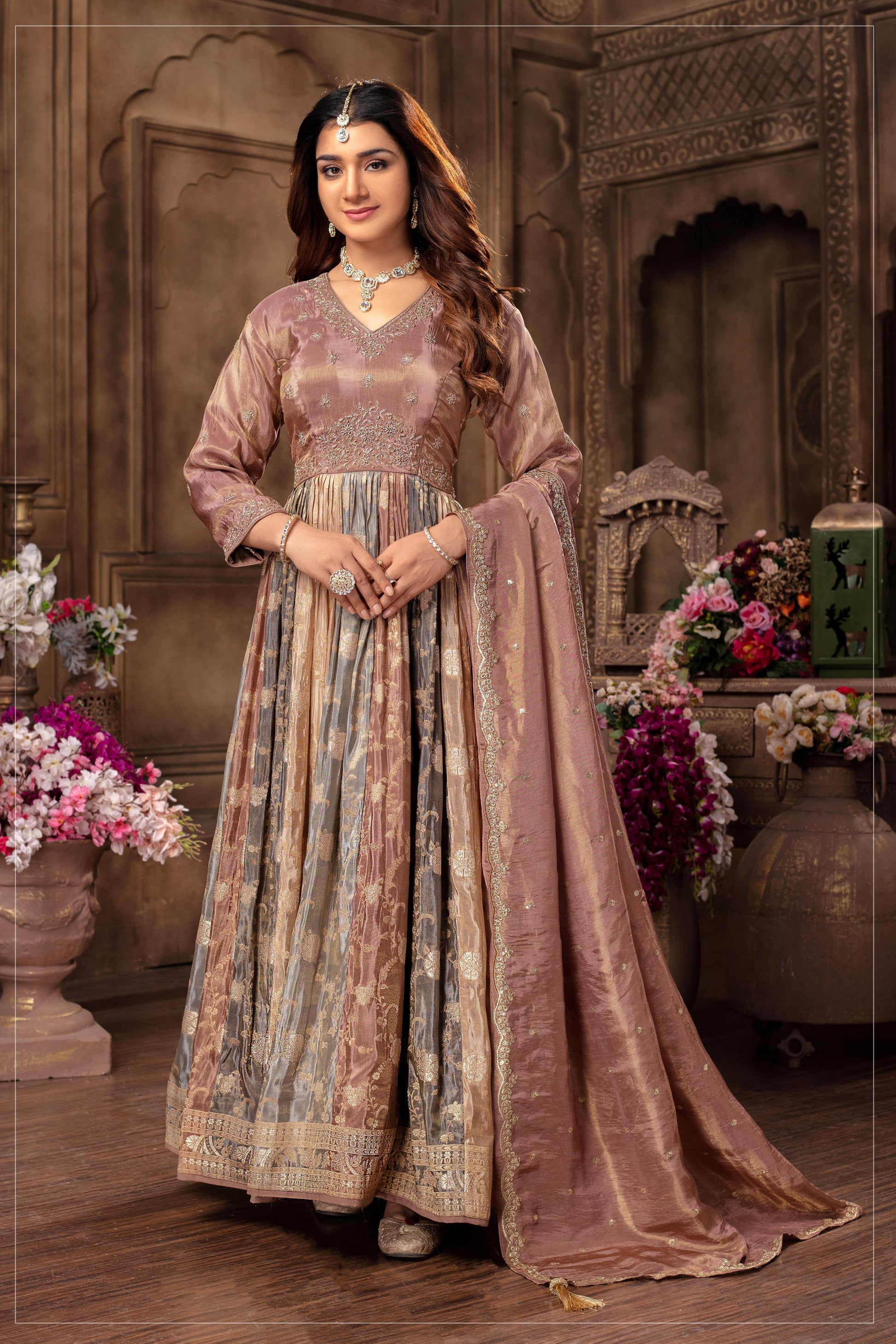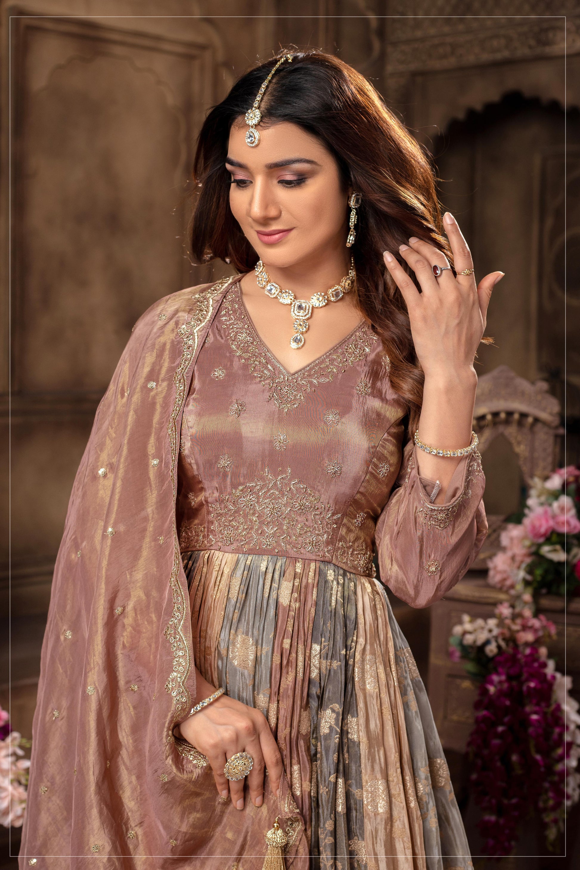 Completing the ensemble is a matching dupatta, adding a final flourish of sophistication to this enchanting outfit. Whether it's a wedding, festive gathering, or any grand event, this onion pink tissue silk anarkali suit promises to make you stand out with its timeless charm and impeccable craftsmanship.