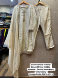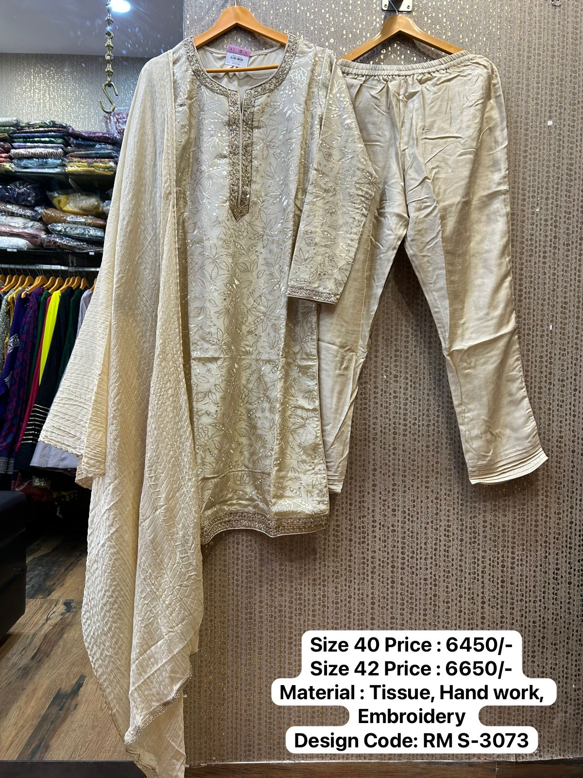 Kalpana’s Creations introduces a stunning DESIGNER ensemble featuring a tissue handwork embroidery dress, paired with stylish pants and a fancy dupatta, offering a modern chic look that seamlessly blends elegance with contemporary fashion.