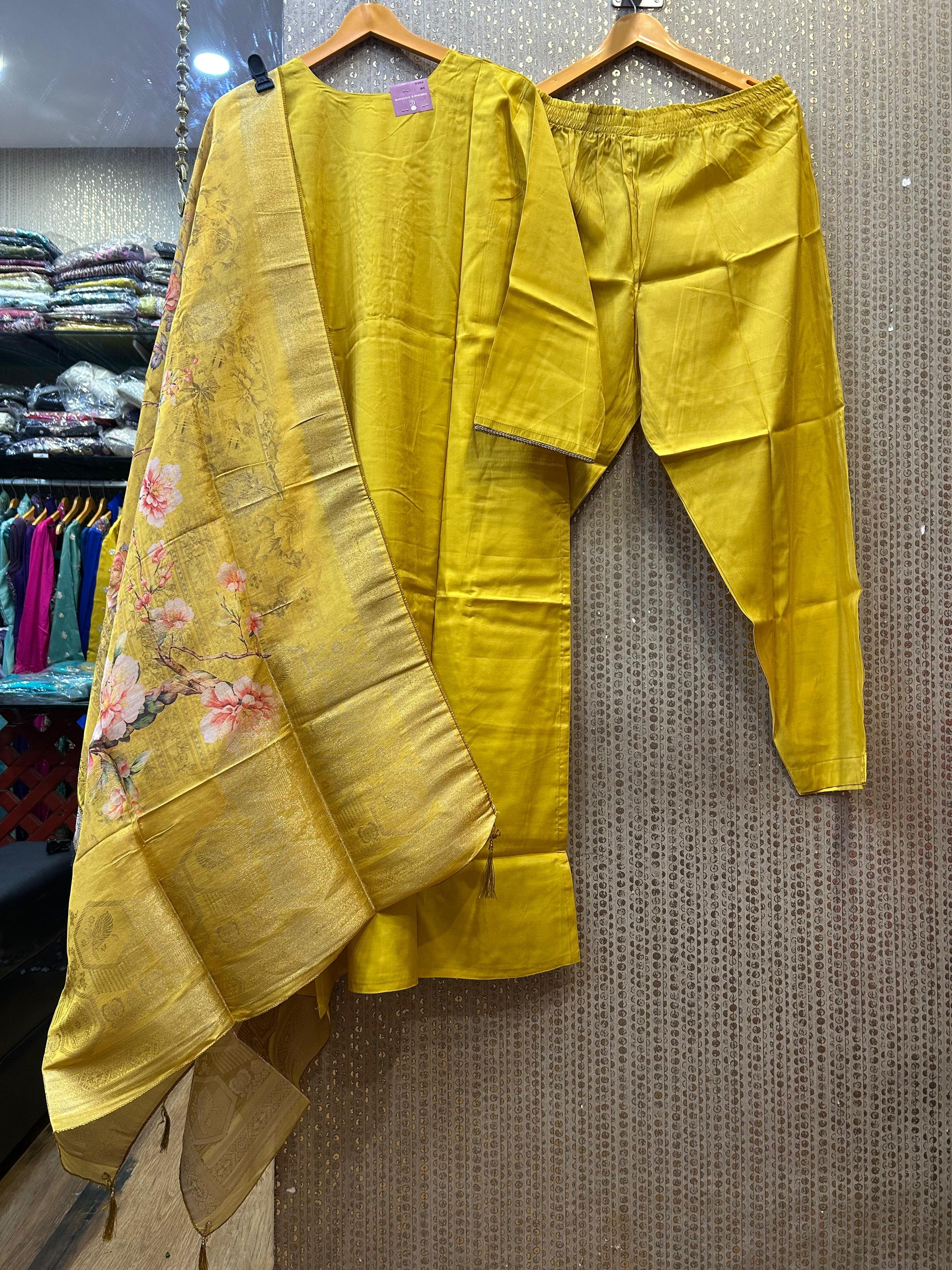 Kalpana’s Creations presents an exquisite DESIGNER silk handwork dress paired with a sleek pant and a gracefully draped dupatta, offering a perfect blend of tradition and modern chic elegance.