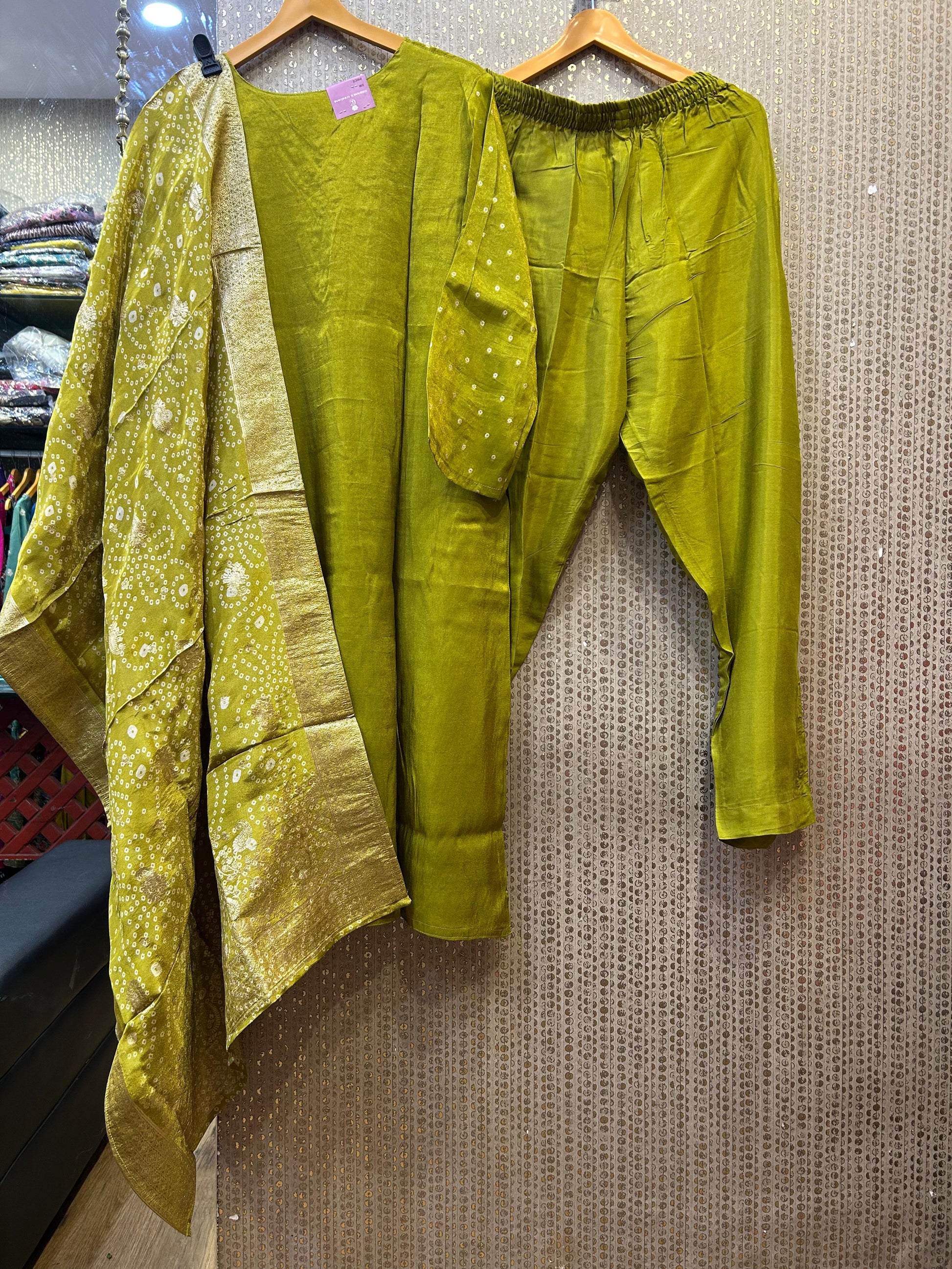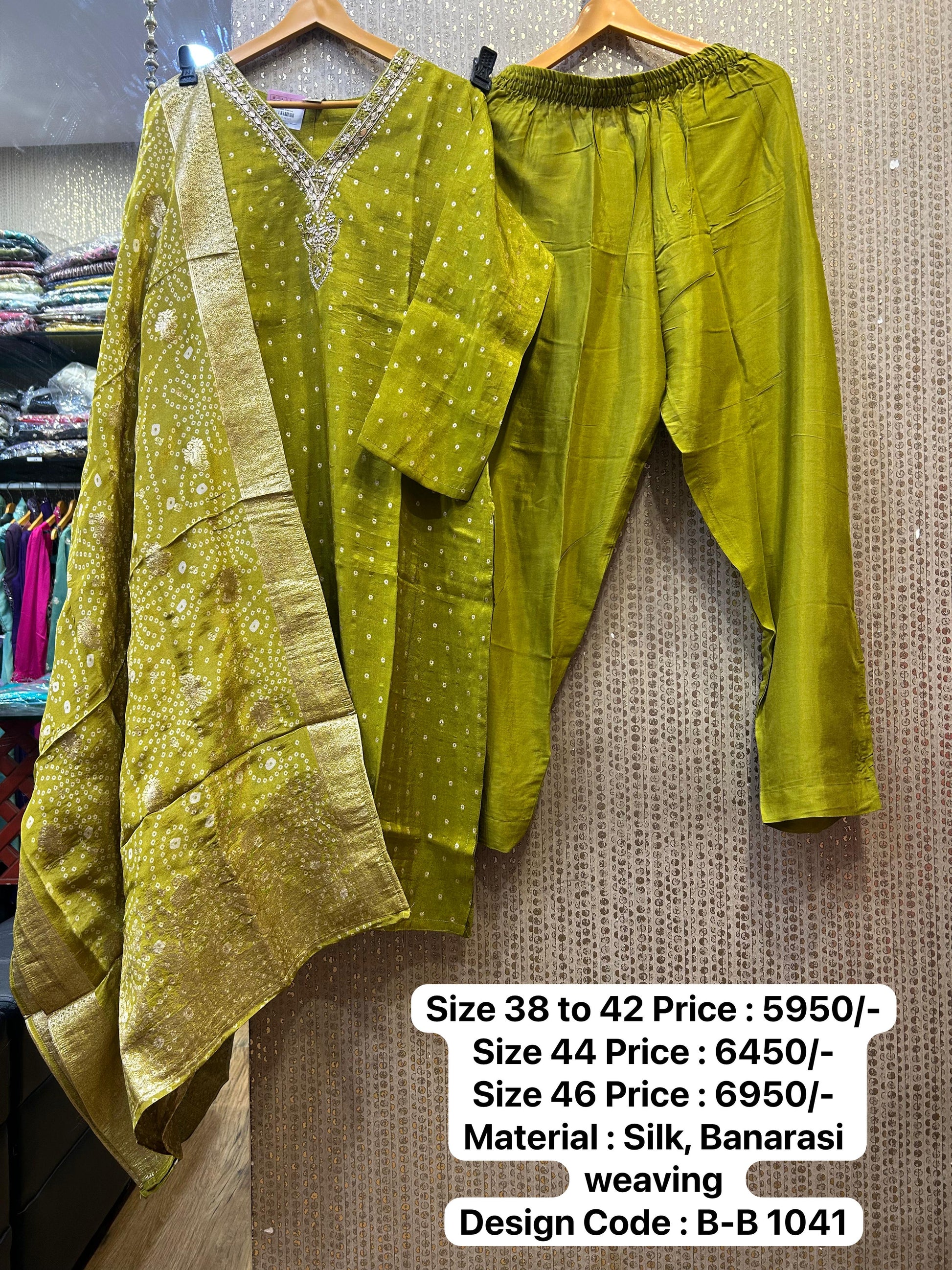 Kalpana’s Creations presents a stunning DESIGNER silk dress and pant ensemble, paired with a Banarasi weaving dupatta, offering a modern chic look that beautifully merges traditional elegance with contemporary flair.