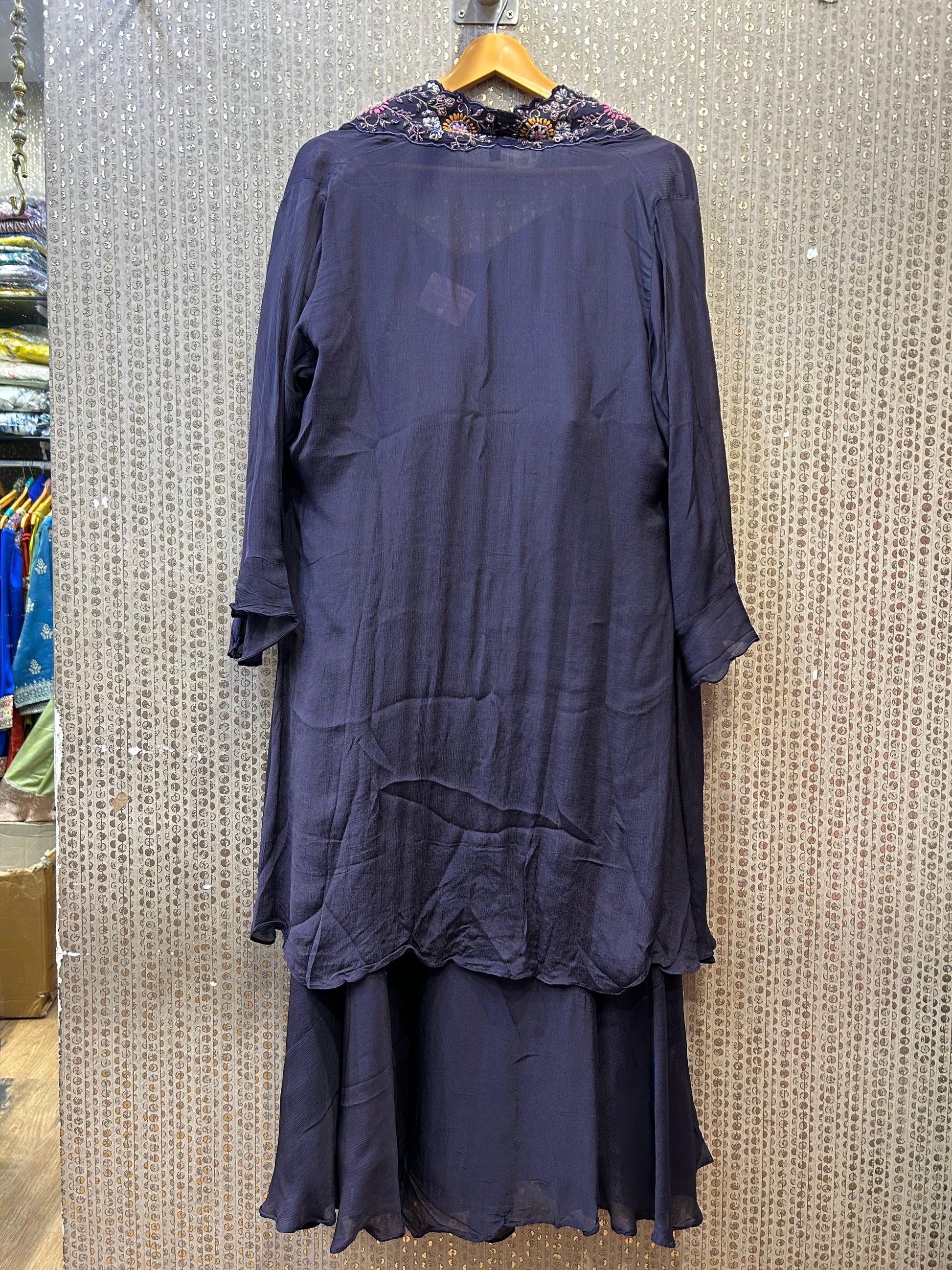 This DESIGNER ensemble from Kalpana’s Creations combines the crepe kaftan, spaghetti blouse, chic jacket, and palazzo pants to create a harmonious blend of contemporary fashion and timeless elegance. Perfect for brunches, evening events, or festive celebrations, this outfit offers a unique and stylish approach to modern dressing, ensuring you stand out effortlessly.