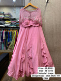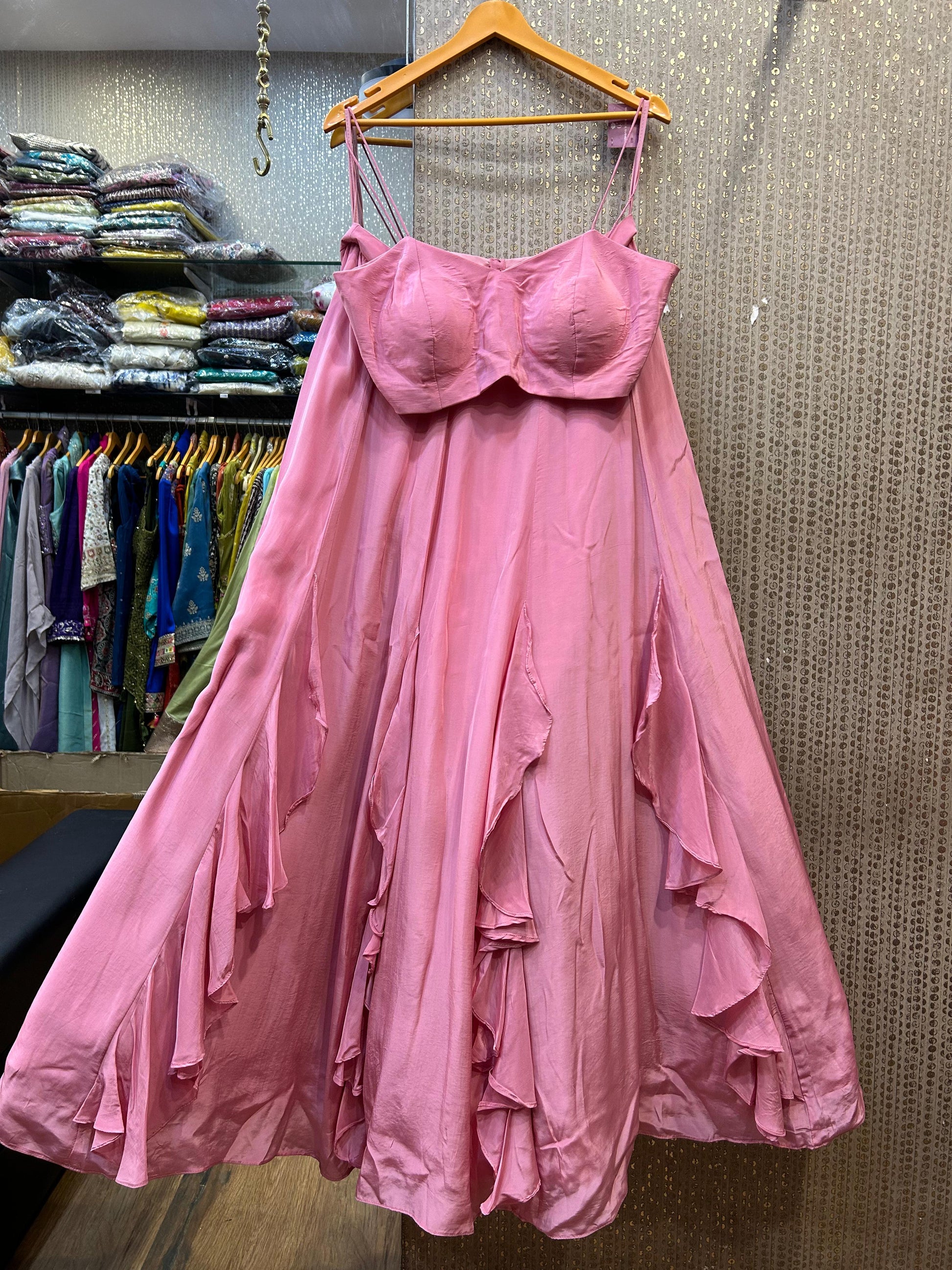 The fancy spaghetti blouse adds a touch of contemporary charm to the ensemble. Its sleek straps and minimalistic design contrast beautifully with the grandeur of the Chaniya, creating a balanced and stylish look. Embellished with delicate details, the blouse complements the outfit's overall sophistication while maintaining a modern edge.