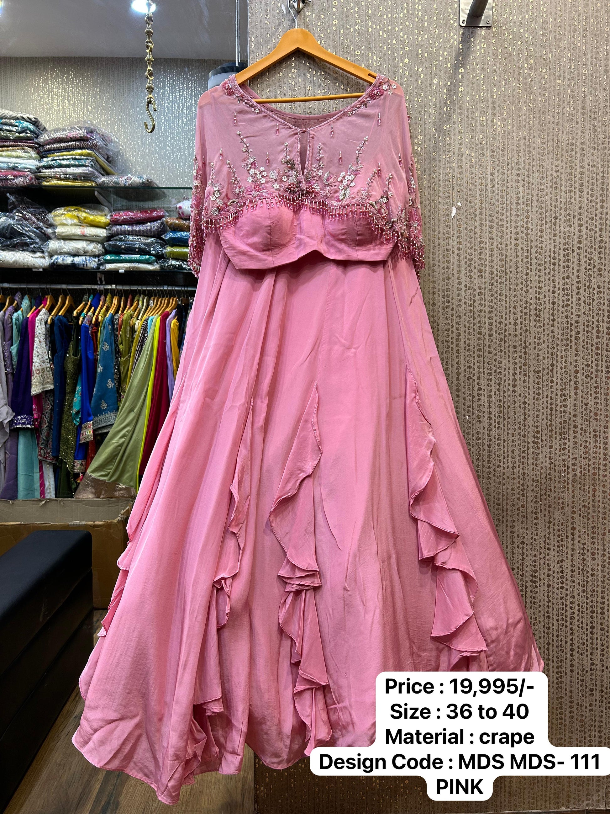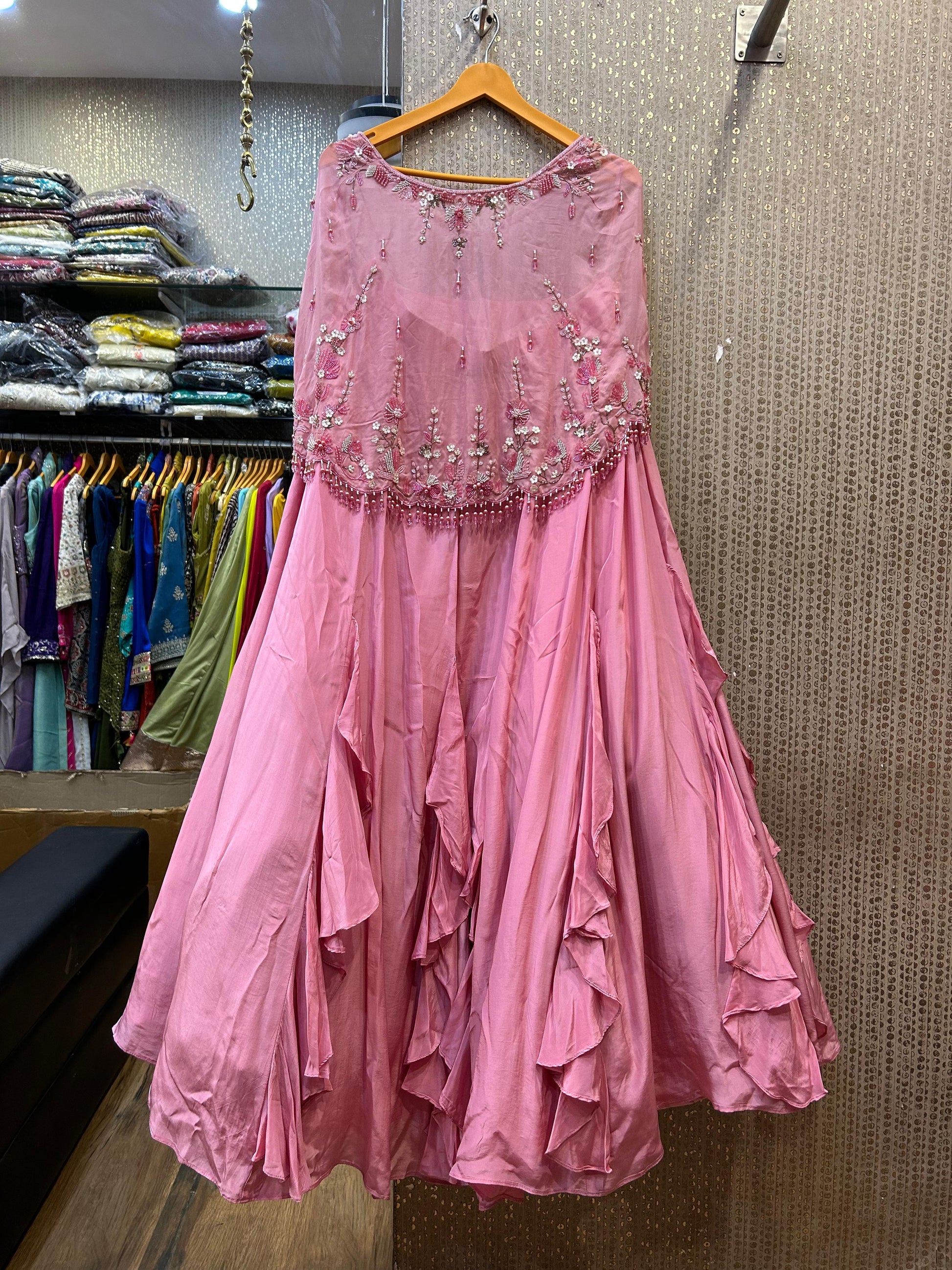 This Kalpana’s Creations outfit, with its heavy Chaniya, fancy spaghetti blouse, and fancy designer jacket, offers a modern chic look that’s perfect for weddings, festive celebrations, or upscale parties. The harmonious blend of traditional and contemporary elements ensures that this ensemble stands out, making it an ideal choice for those who love to make a bold style statement.