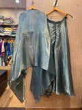 Completing the outfit is a kaftan-style jacket, offering a unique and stylish layer. The flowing silhouette of the jacket, combined with intricate detailing, adds a touch of drama and sophistication. Its versatile open-front design and soft drape make it a perfect addition, effortlessly tying together the blouse and palazzo for a cohesive and fashionable ensemble.