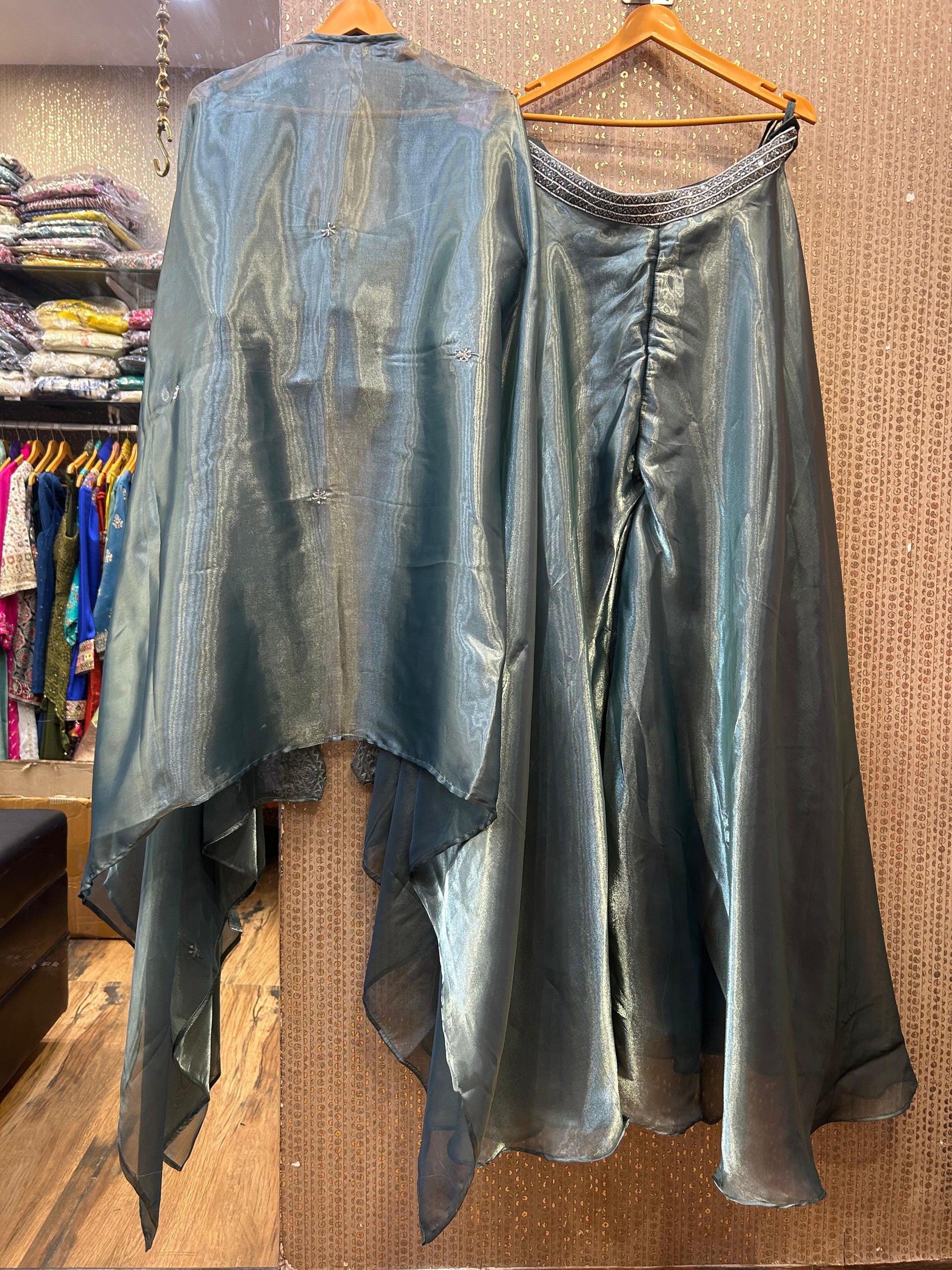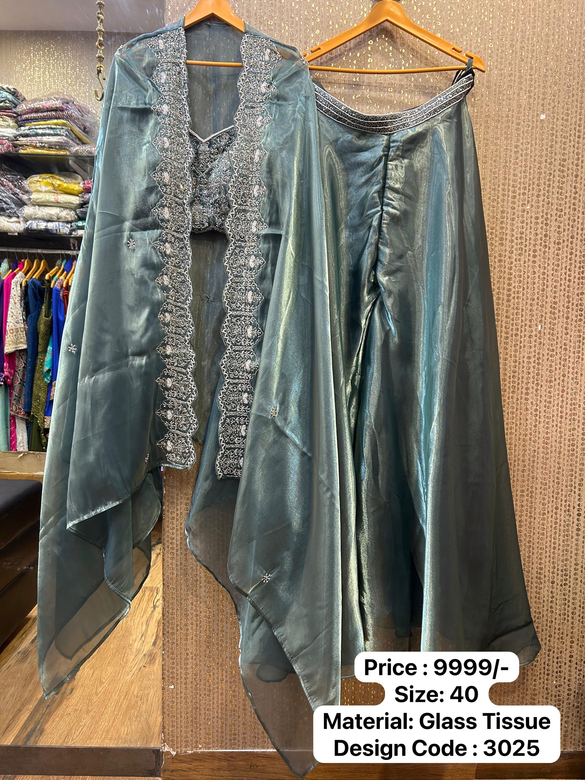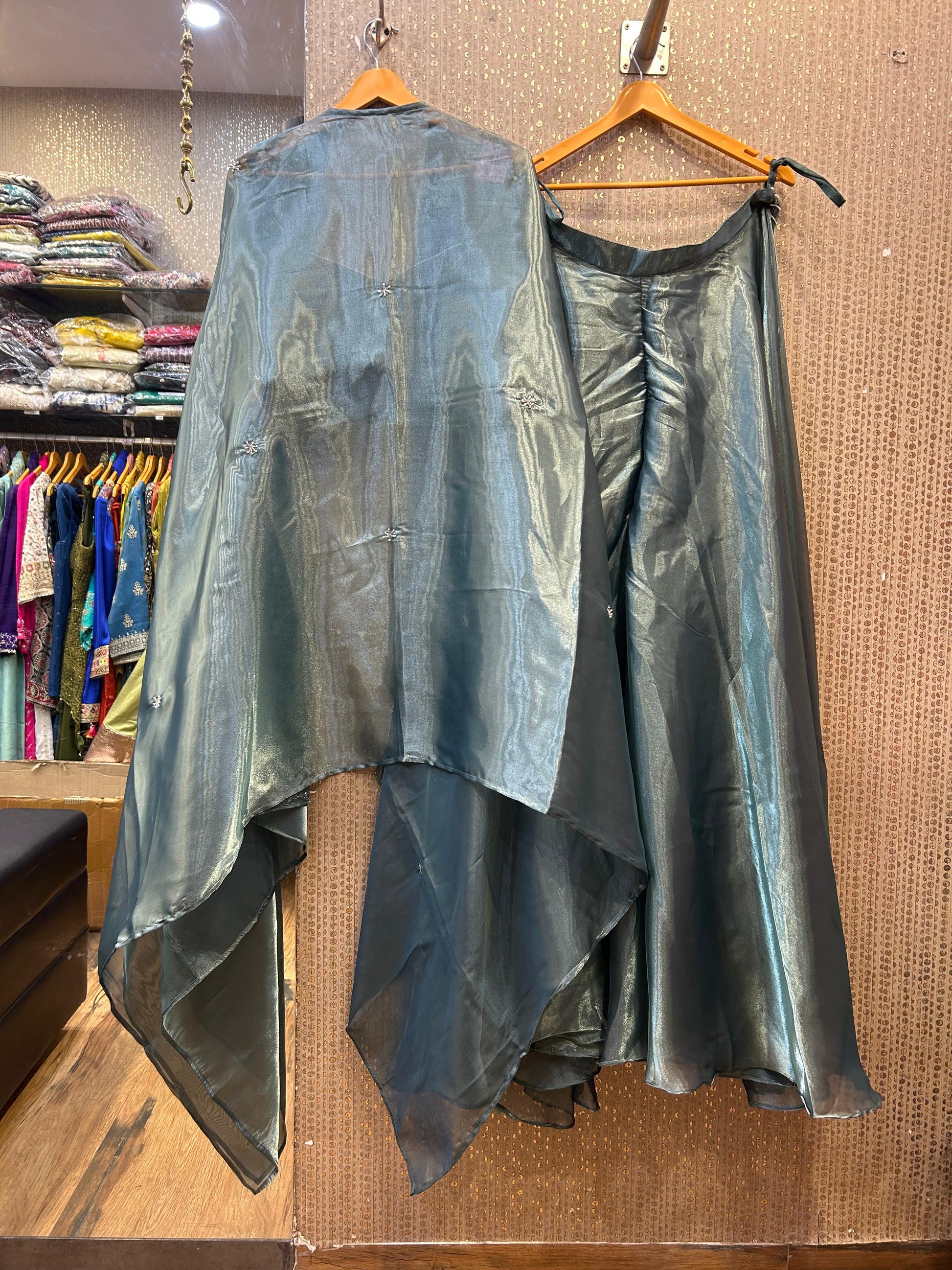 Kalpana’s Creations presents an exquisite DESIGNER ensemble featuring a tissue-based palazzo, a fancy spaghetti blouse, and a kaftan-style jacket, perfectly combining traditional elegance with a modern chic flair.