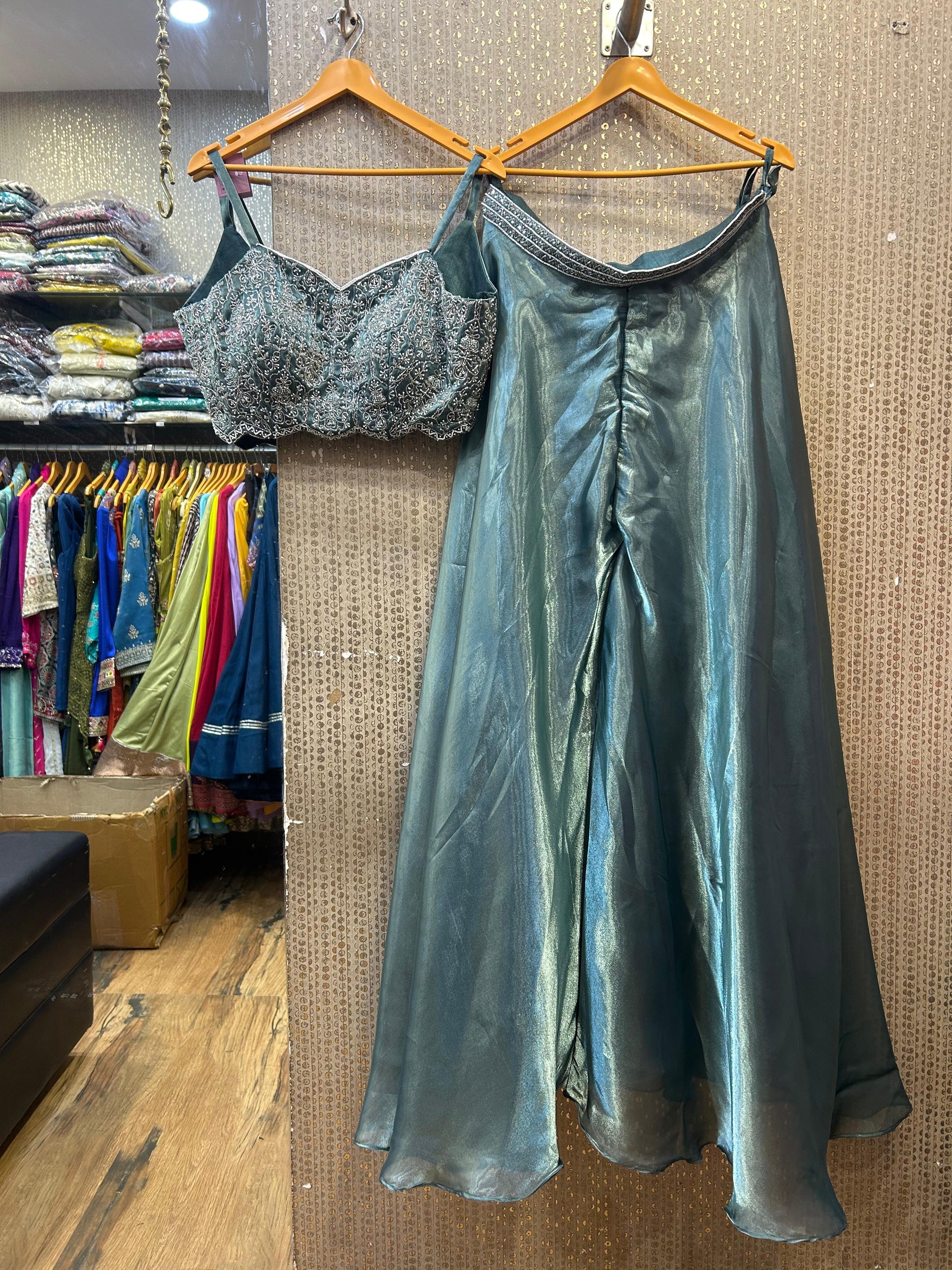 The flowing tissue-based palazzo is the epitome of understated luxury. With its lightweight, shimmery fabric, the palazzo adds a subtle touch of glamour to the ensemble. The wide-leg silhouette enhances comfort and movement, making it ideal for both formal and semi-formal occasions. Its sophisticated design allows for versatility while maintaining a chic aesthetic.