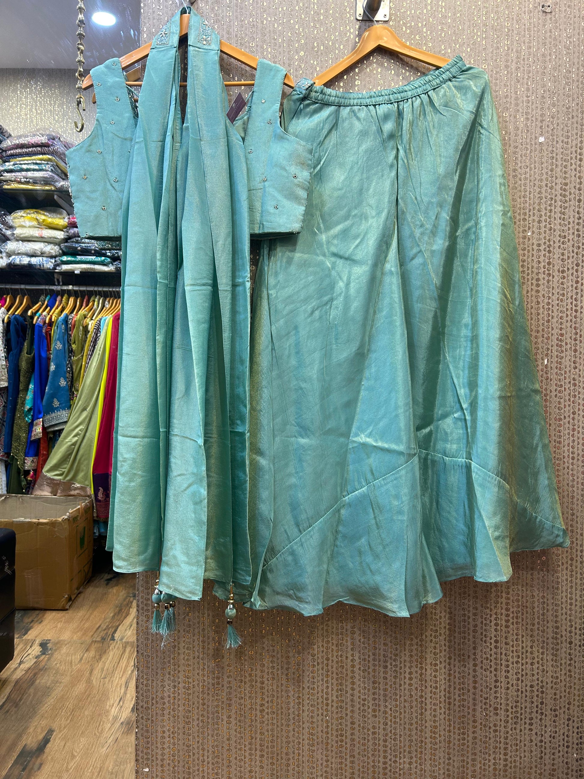 Adding an innovative touch to the outfit is the choker-style dupatta, designed to be worn draped elegantly around the neck and shoulders. This unique accessory elevates the overall look, blending tradition with modern design. The dupatta features subtle embellishments and a graceful fall, making it an exquisite addition to this chic ensemble.
