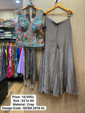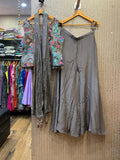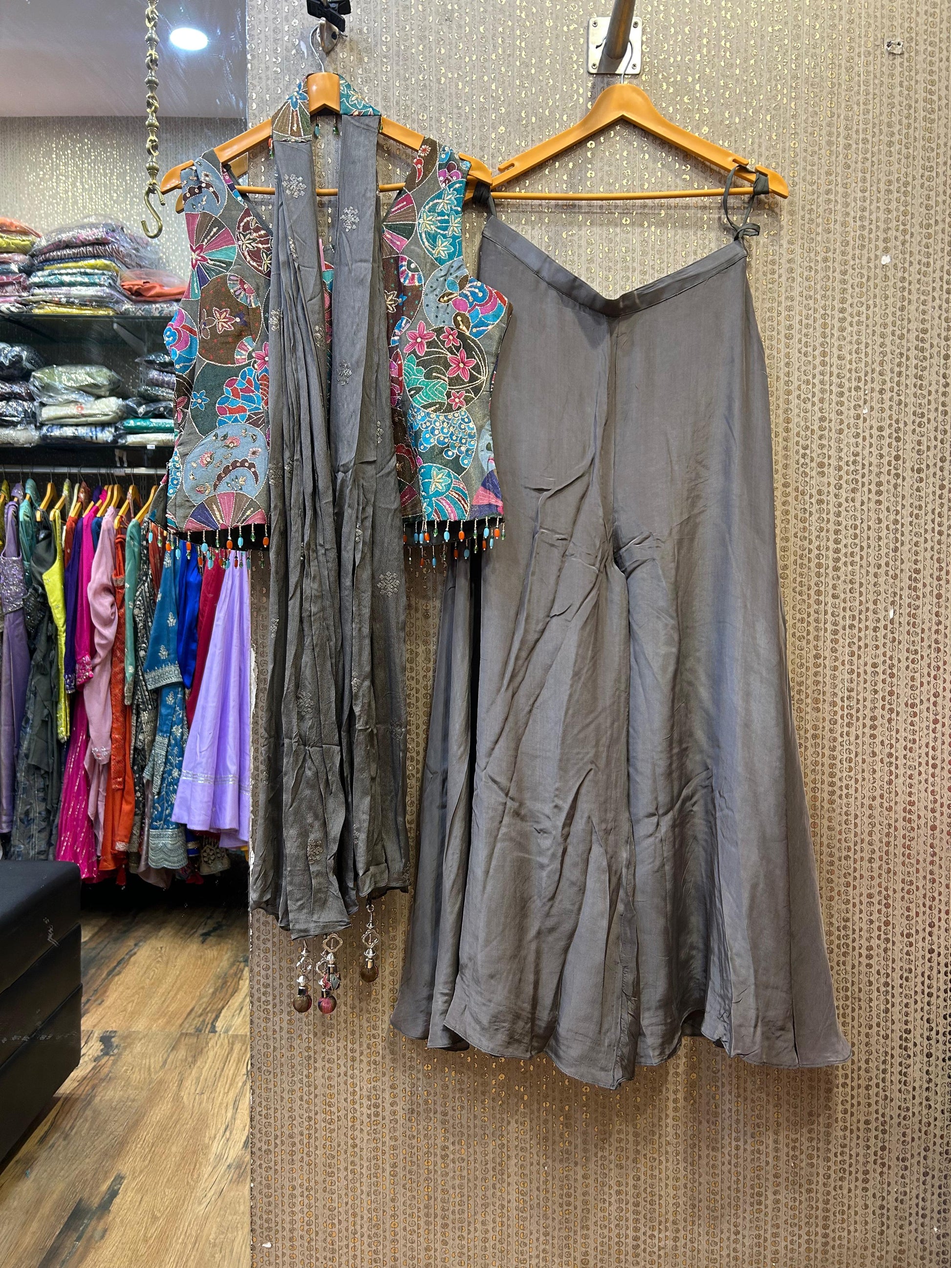 Kalpana’s Creations presents a stunning DESIGNER ensemble featuring a stylish palazzo, a havay peplum top, and a choker-styled dupatta, creating a modern chic look that seamlessly blends contemporary fashion with traditional elegance.