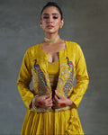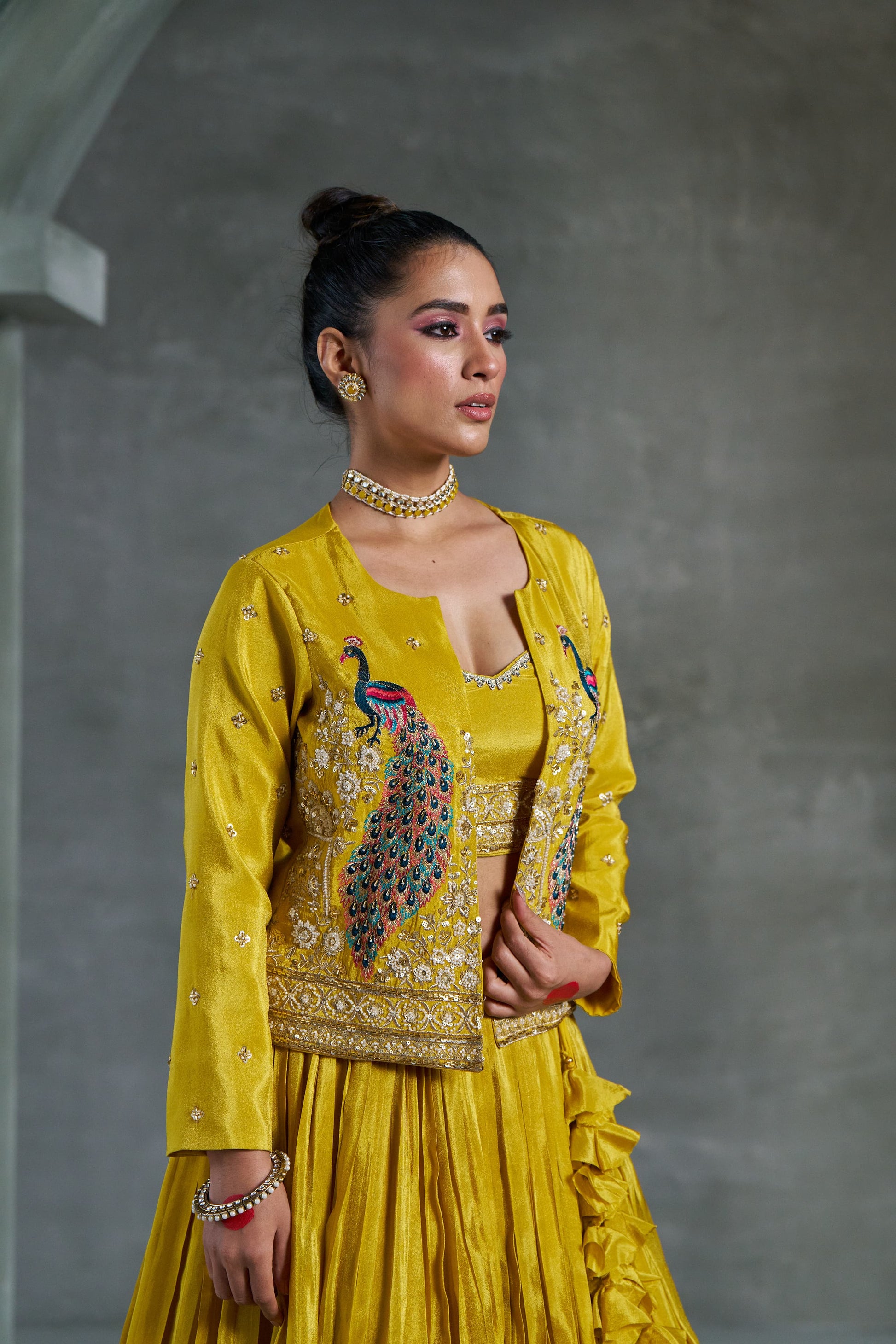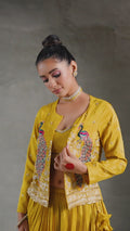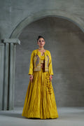 The standout feature of this outfit is the heavy handwork jacket, meticulously adorned with intricate embroidery and embellishments. The jacket’s detailed design adds a layer of opulence, enhancing the overall ensemble. Its structured yet elegant silhouette complements the flowing Chaniya and sleek blouse, completing the look with a statement of modern elegance.