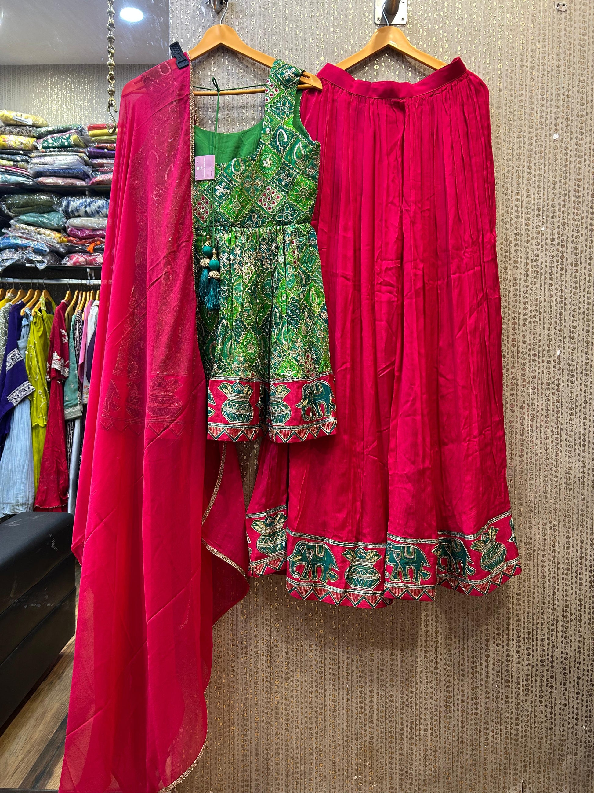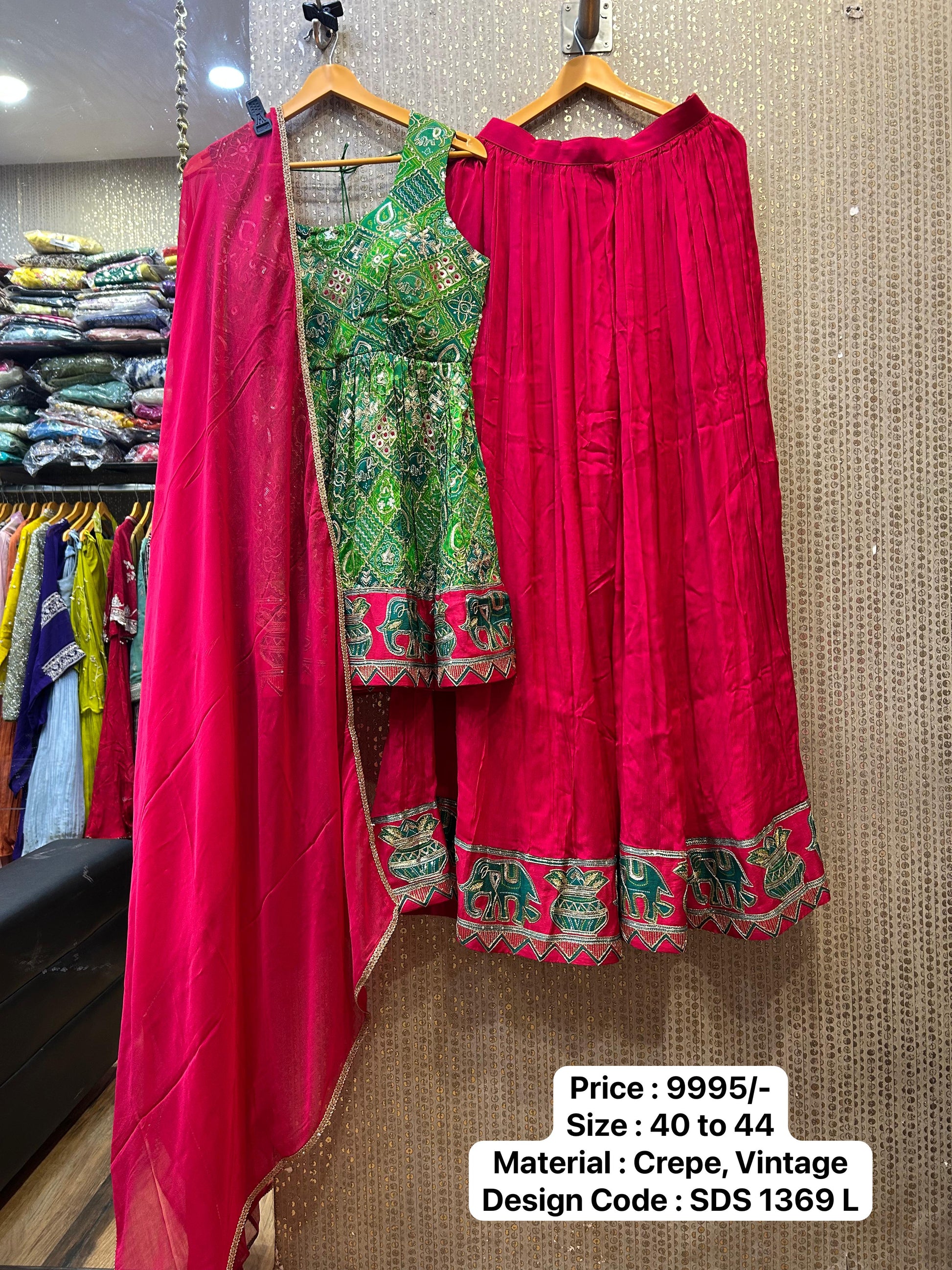 Kalpana’s Creations unveils an exquisite DESIGNER ensemble featuring a vintage border Chaniya, a crepe vintage top, and a complementing dupatta, blending timeless elegance with a modern chic flair.