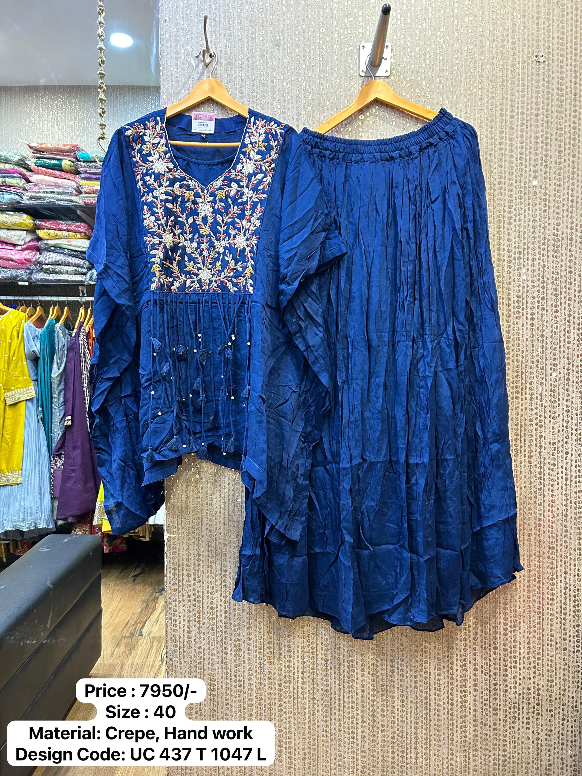 Kalpana’s Creations presents a stunning DESIGNER cape-style handwork ensemble, paired with a fancy Chaniya, delivering an effortlessly modern chic look.