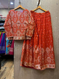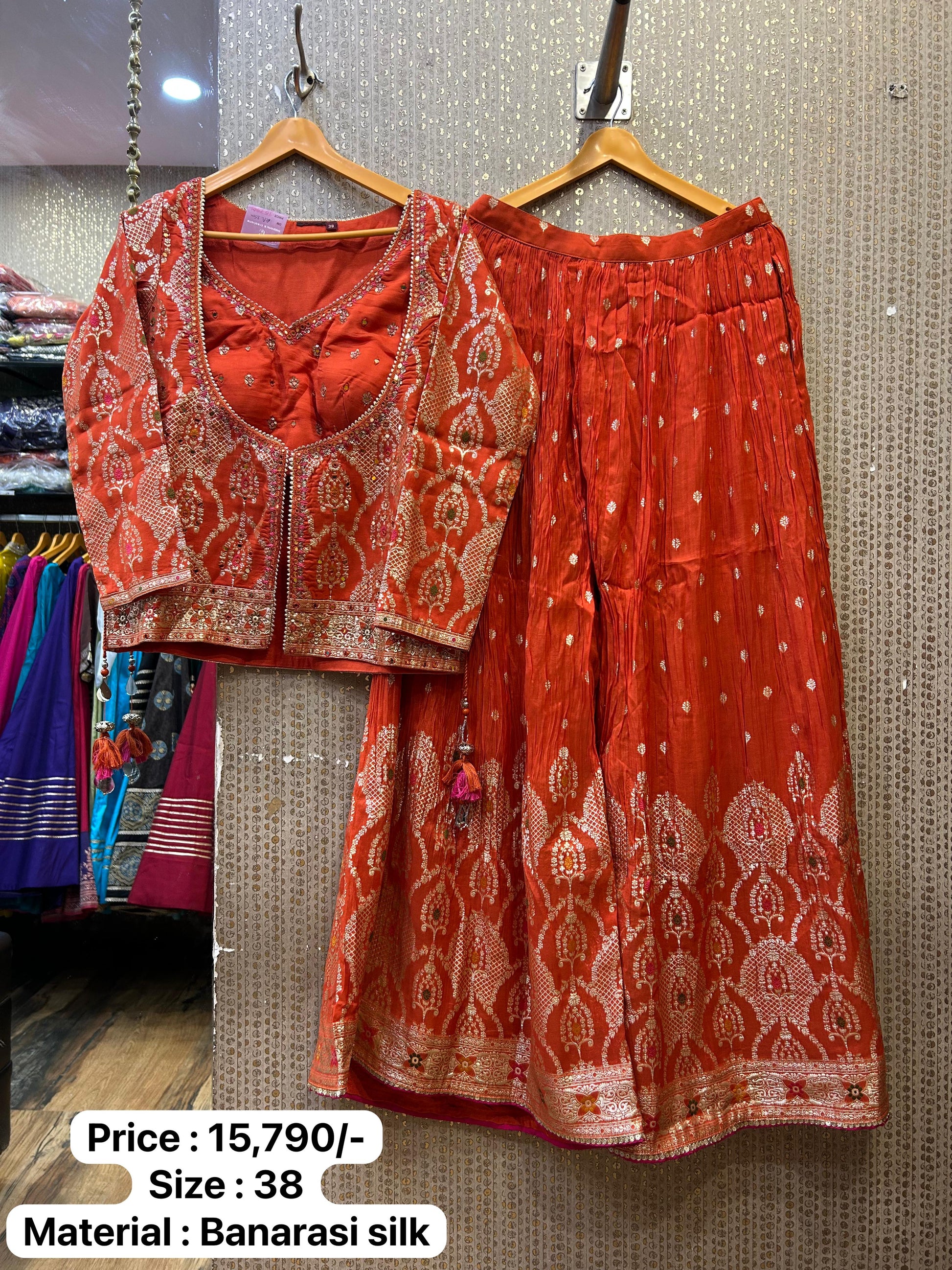 Adding a layer of sophistication is the stylish jacket, tailored with precision to complement the silk blouse and palazzos. The jacket features elegant embroidery or subtle embellishments that accentuate the regal charm of Banarasi silk. With its structured silhouette and flowing hemline, the jacket adds movement and dimension, offering a perfect balance of tradition and trend.
