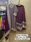 The centerpiece of this outfit is the georgette heavy dress, designed with intricate detailing and a flowy silhouette. The lightweight yet richly textured fabric drapes beautifully, creating an elegant and regal appearance. The embellishments on the dress add a subtle shimmer, enhancing its sophistication and making it a perfect choice for formal events or festive celebrations.