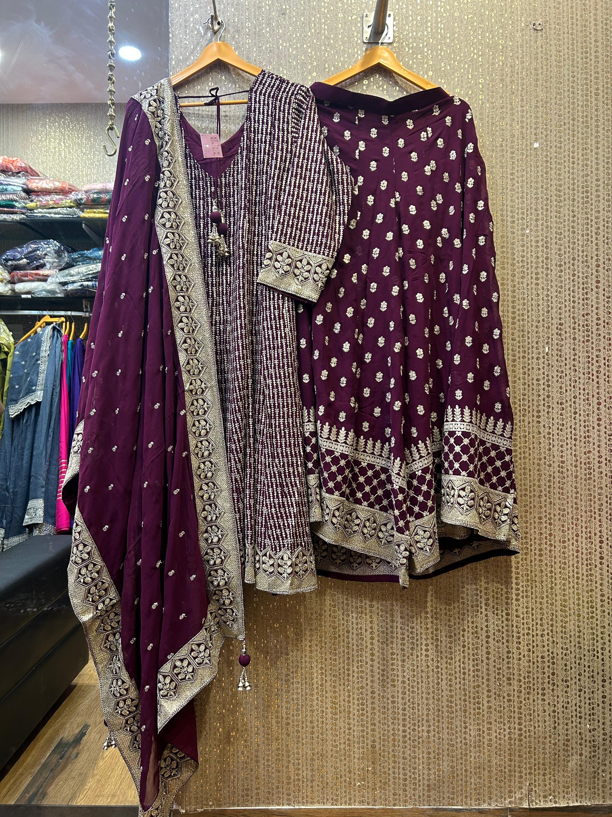 Kalpana’s Creations introduces a stunning DESIGNER ensemble crafted from luxurious georgette material, featuring a heavy dress, stylish palazzo, and a fancy designer dupatta, offering a modern chic look ideal for various occasions.