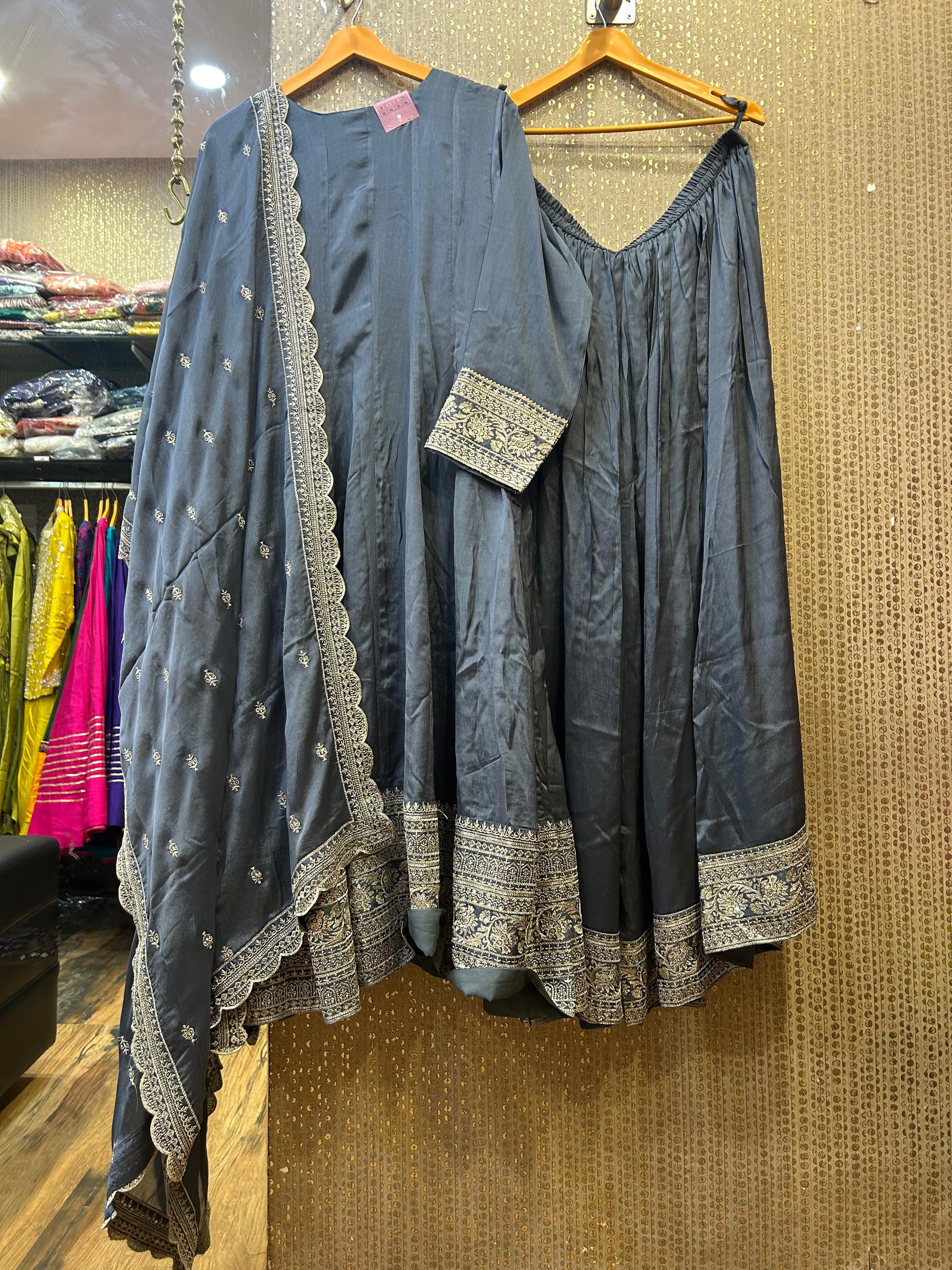 The outfit is completed with a fancy dupatta, which adds an additional layer of elegance to the ensemble. Its intricate detailing, combined with the soft flow of the fabric, creates a refined, graceful effect. The dupatta can be draped effortlessly over the shoulder or across the body, giving the outfit a modern twist on traditional elegance.