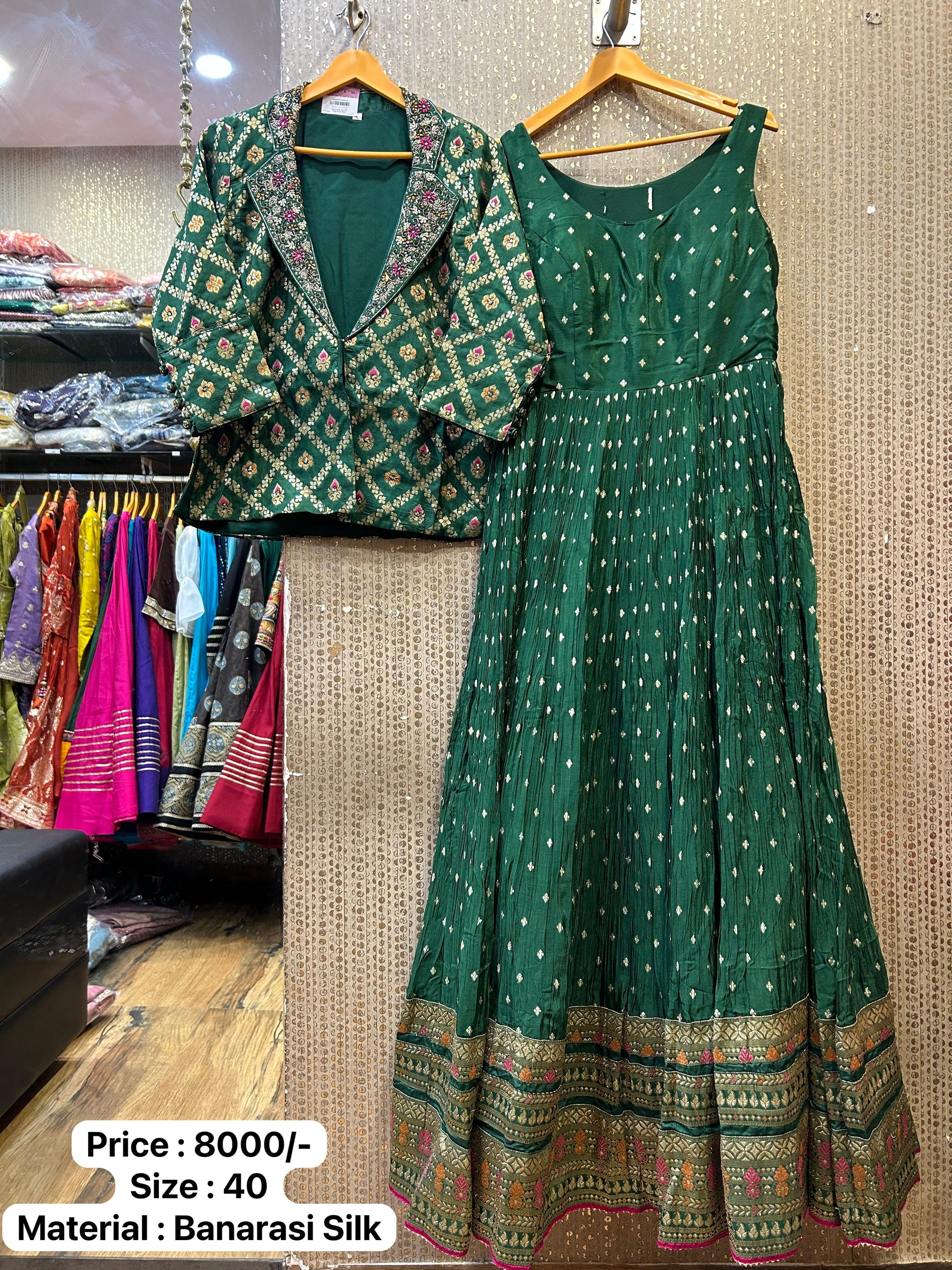Complementing the gown is a fancy Banarasi jacket that elevates the entire ensemble. This jacket is designed with the same exquisite Banarasi silk, adorned with delicate patterns and intricate embroidery. The structured design of the jacket adds an element of sharpness to the outfit, providing a perfect contrast to the fluidity of the gown. The jacket's refined detailing and luxurious fabric make it a standout piece, bringing a modern edge to a classic look.