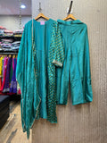 Completing the look is a fancy designer dupatta, adding a final touch of elegance. Adorned with delicate embroidery and intricate detailing, the dupatta drapes effortlessly over the outfit, giving it a graceful flow. The luxurious fabric and embellishments enhance the modern yet traditional vibe of the ensemble, making it suitable for both formal and festive events.