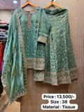 The centerpiece of this outfit is the stunning pure tissue dress, crafted with luxurious fabric that exudes an ethereal glow. The dress is intricately embroidered with delicate threadwork, creating a rich, textured effect that enhances its sophistication. The elegant silhouette of the dress allows for a flattering fit, making it perfect for both formal and semi-formal occasions. The heavy embroidery adds a regal touch, ensuring you stand out with every step.