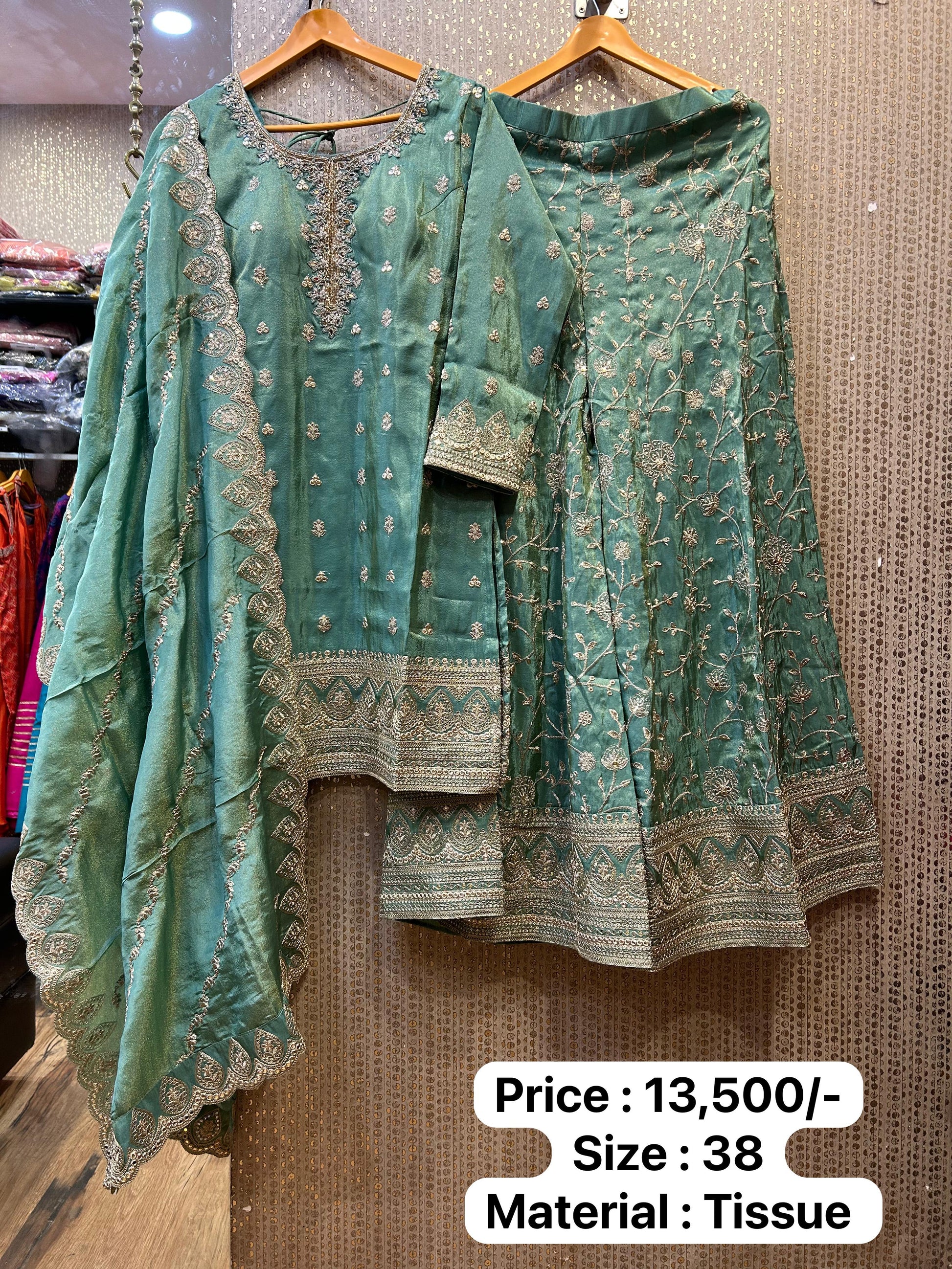 This Kalpana’s Creations outfit, featuring the pure tissue heavy embroidery work dress, embroidered palazzo, and fancy designer dupatta, delivers a modern chic look that seamlessly blends intricate craftsmanship with contemporary elegance. Whether you're attending a wedding, festive celebration, or an upscale event, this ensemble ensures a timeless yet fashionable appearance that will leave a lasting impression.