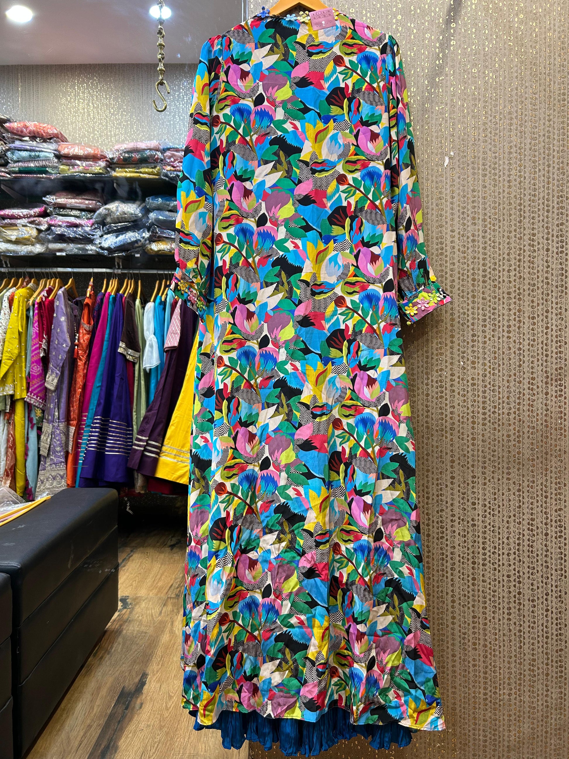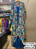 Adding a contemporary twist is the fancy long jacket, designed to elevate the gown to new heights of sophistication. The jacket features elaborate embroidery, beadwork, and an open-front design, creating a striking contrast against the silk gown. Its structured silhouette enhances the overall look, while the flowing length adds an air of elegance and drama.