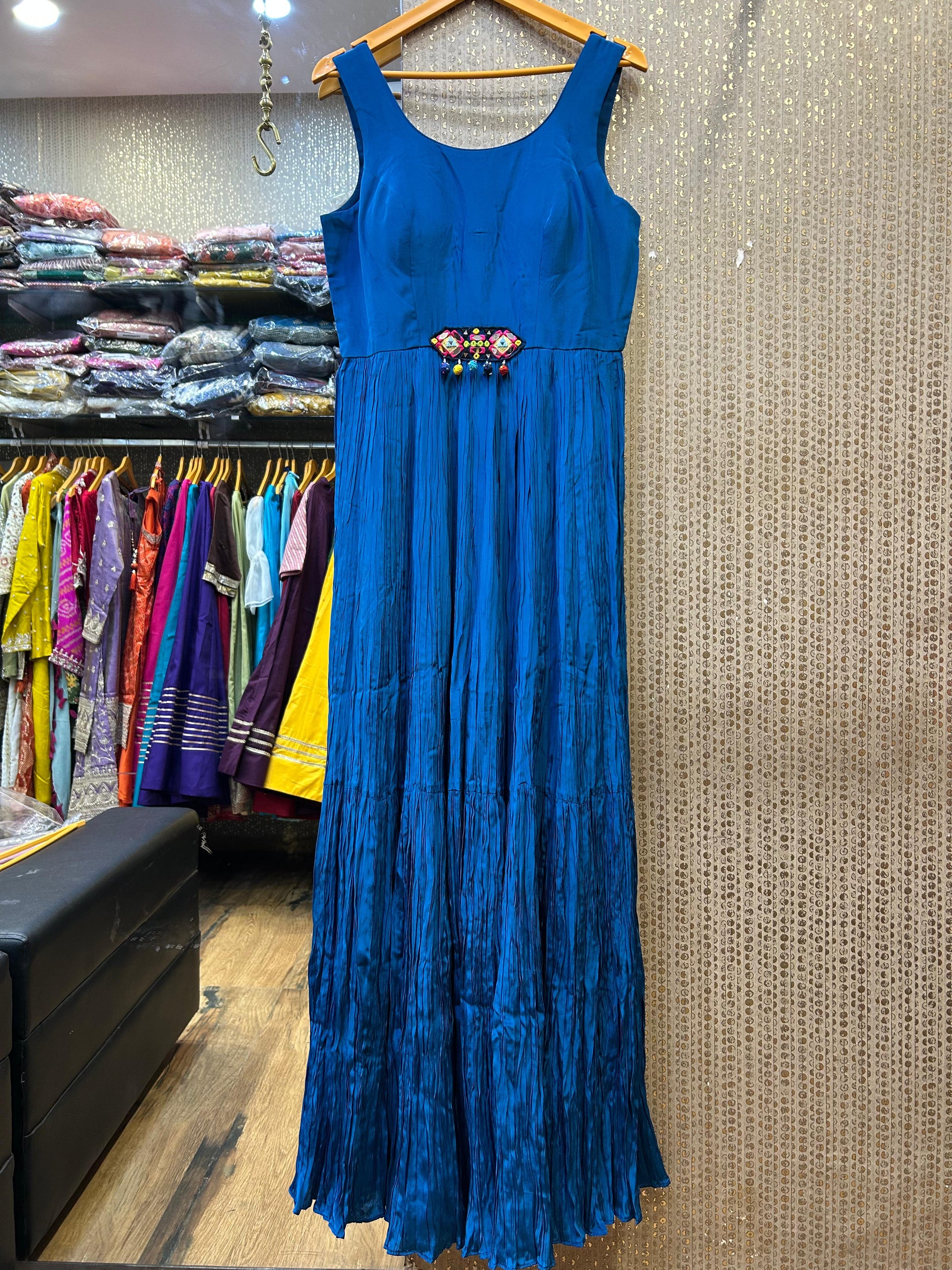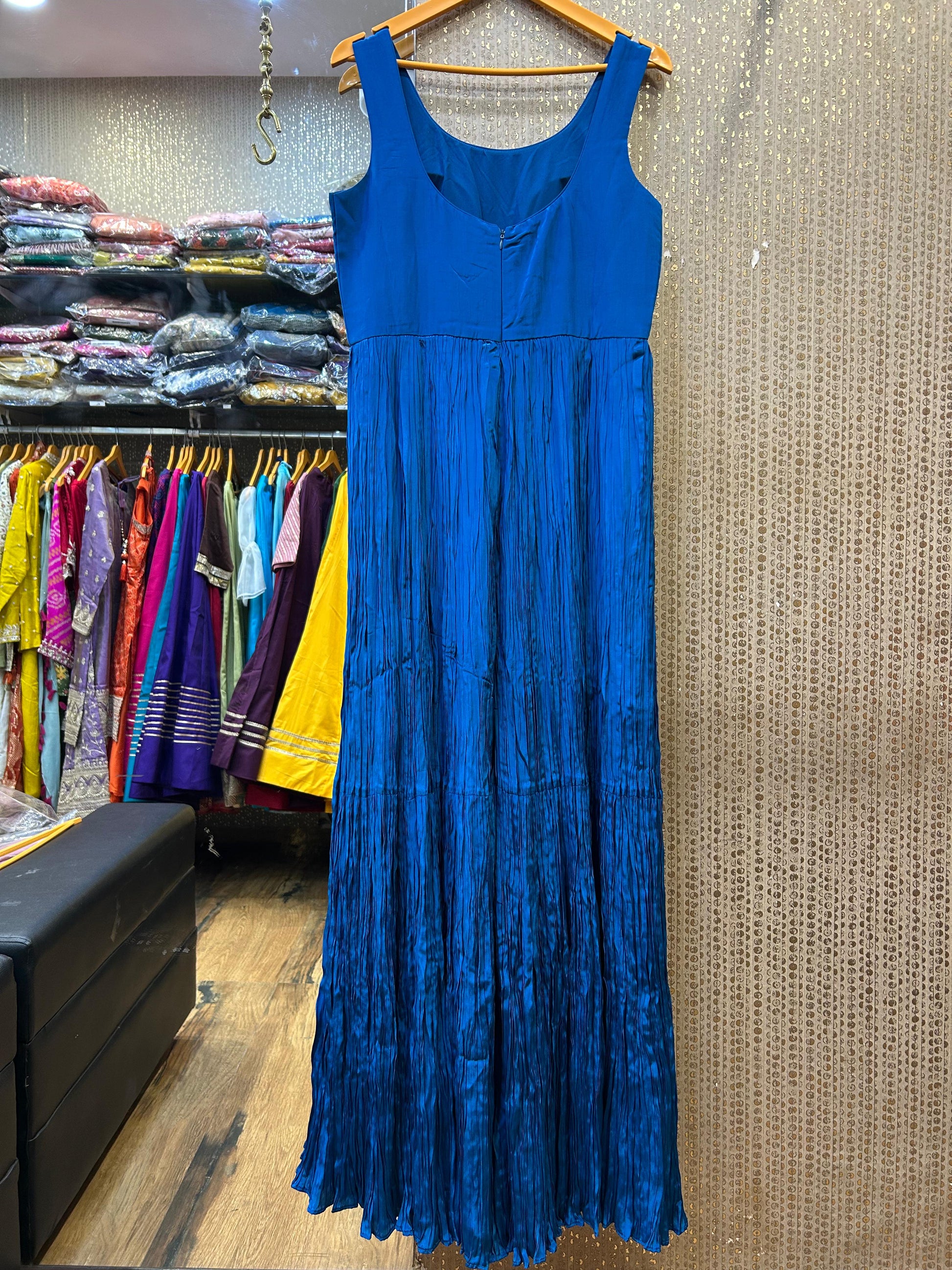 Kalpana’s Creations presents an elegant DESIGNER ensemble featuring a pure silk heavy gown paired with a fancy long jacket, blending timeless luxury with a modern chic aesthetic.