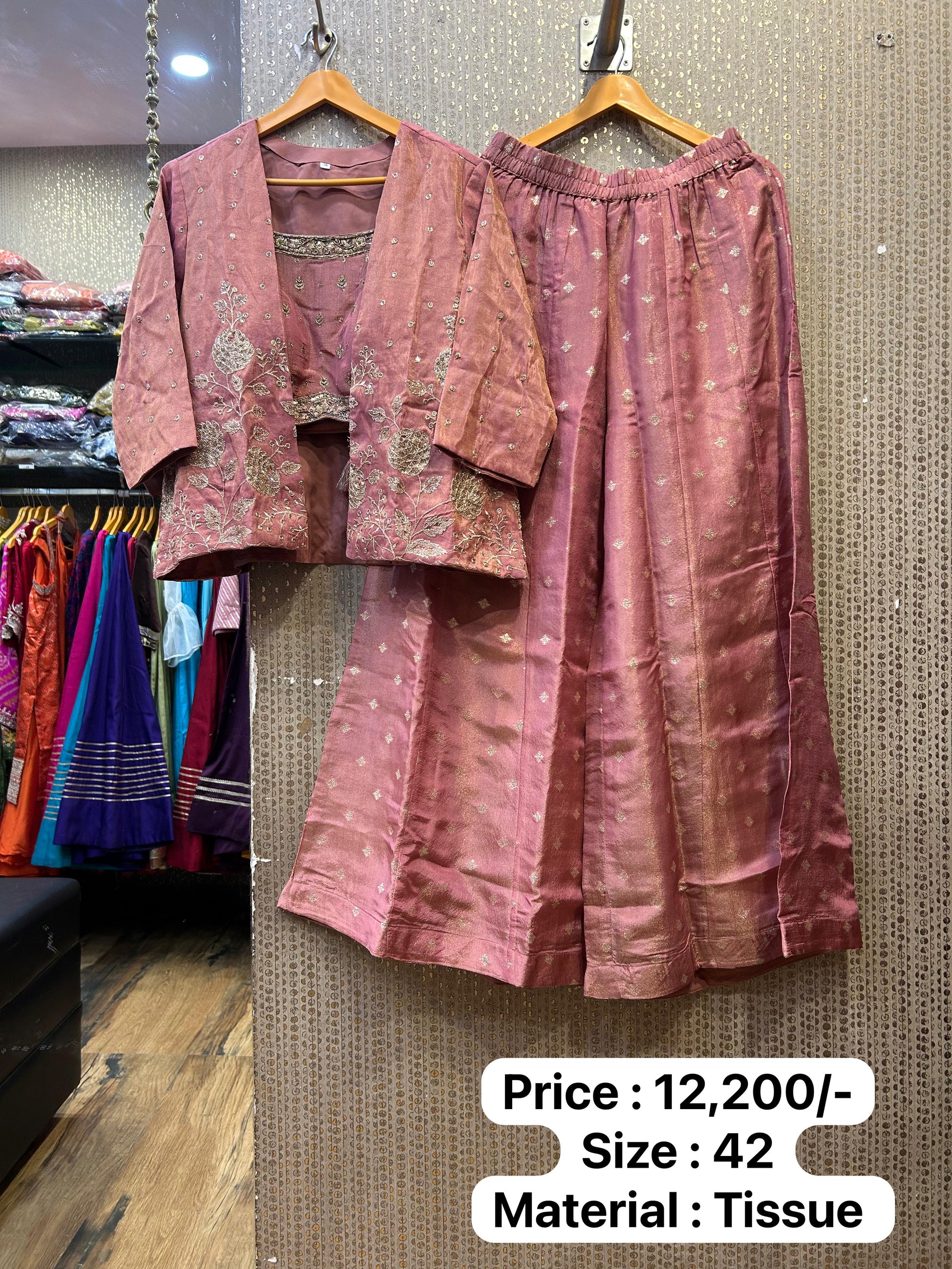 Kalpana’s Creations introduces an elegant DESIGNER ensemble featuring a tissue heavy palazzo, a fancy tissue-based blouse, and a tissue designer jacket, combining luxurious textures with a modern chic aesthetic.