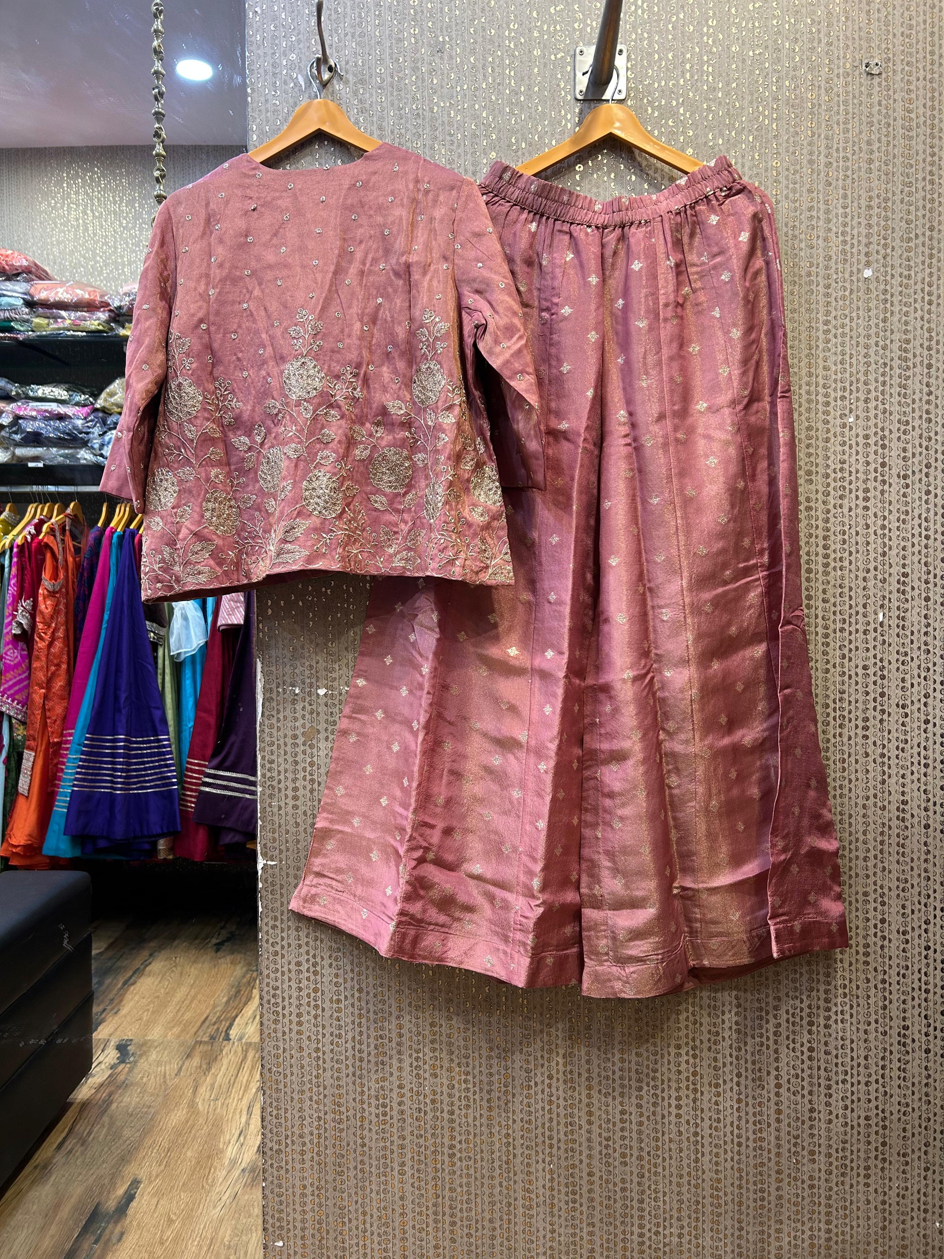 The tissue designer jacket is the crowning glory of this ensemble. Featuring a structured yet flowing silhouette, the jacket is adorned with subtle embellishments that complement the blouse and palazzo. The open-front design and soft shimmer of the tissue fabric lend a contemporary edge while maintaining a timeless elegance.