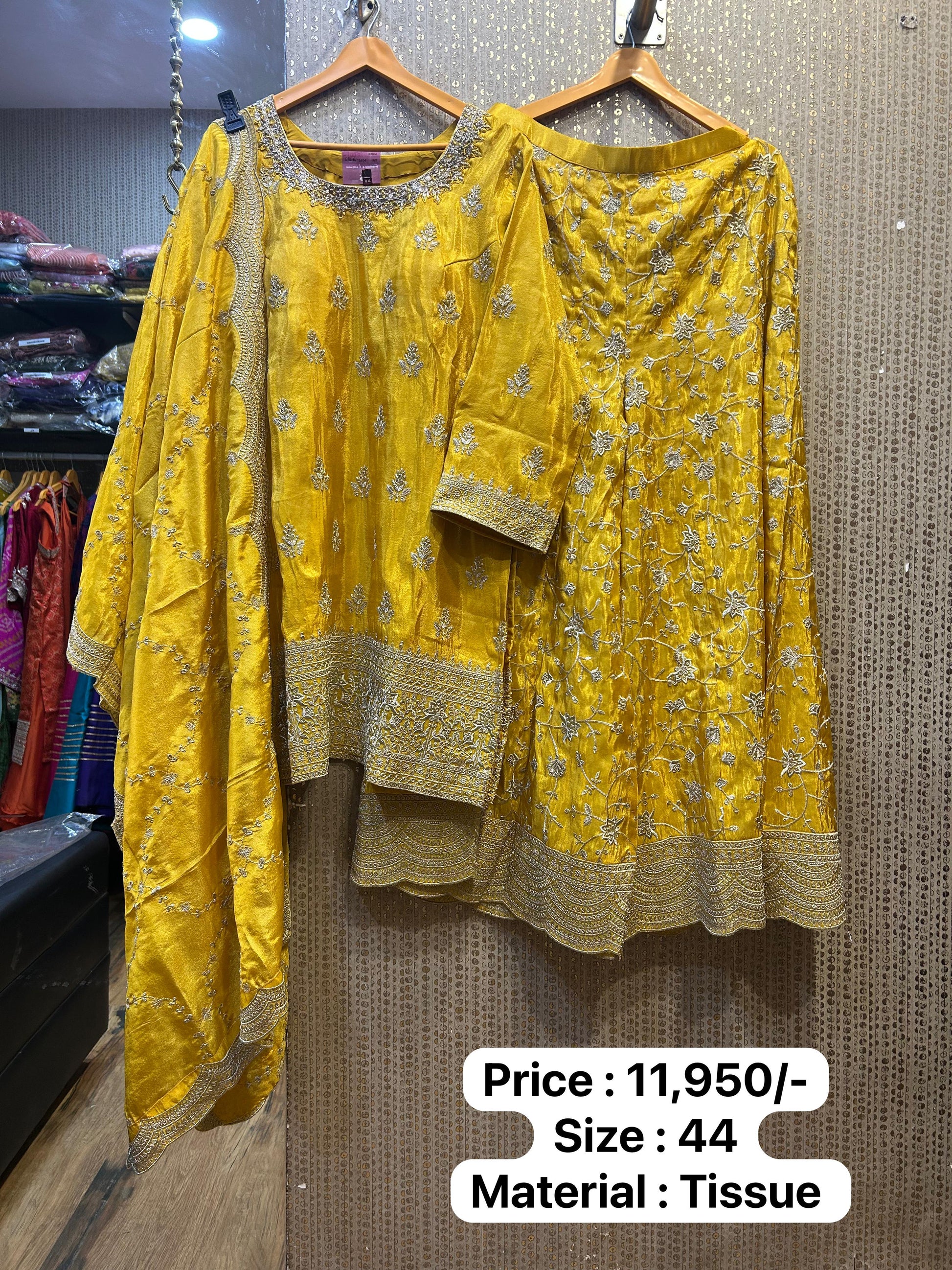 Kalpana’s Creations introduces an elegant DESIGNER ensemble featuring a tissue-based dress with intricate handwork and tiki work, paired with fancy palazzos and a designer dupatta, delivering a modern chic look that exudes sophistication and style.