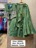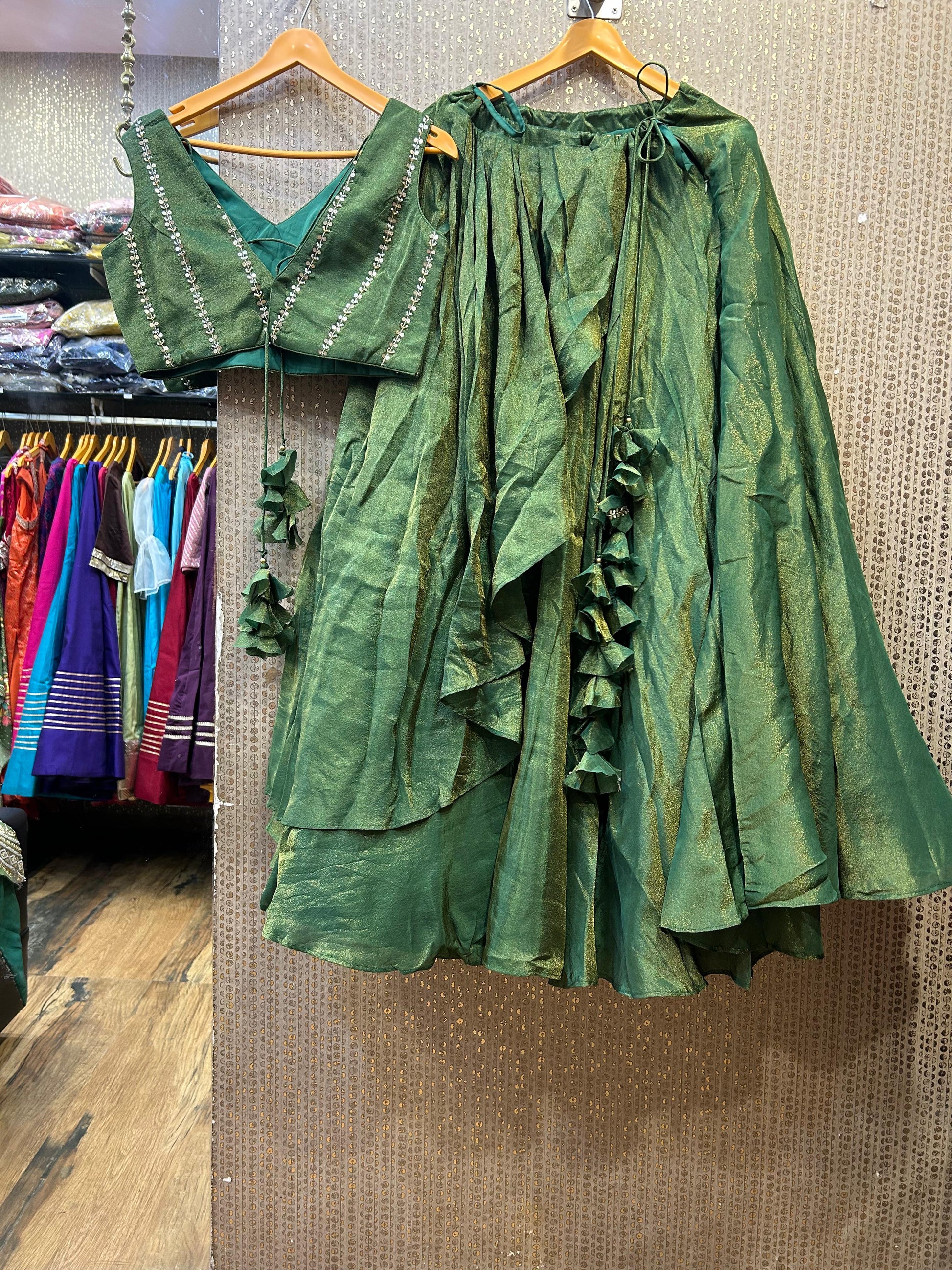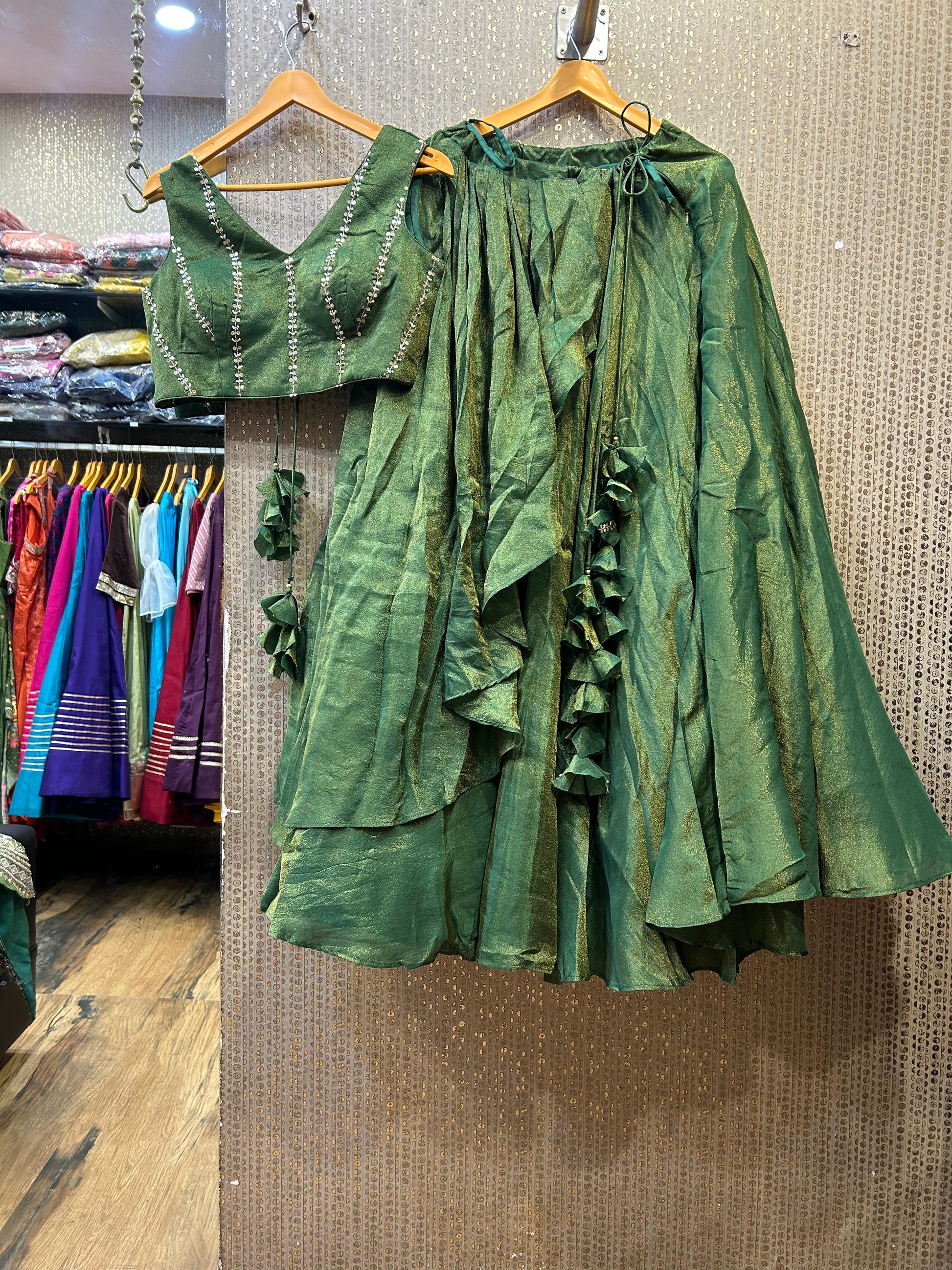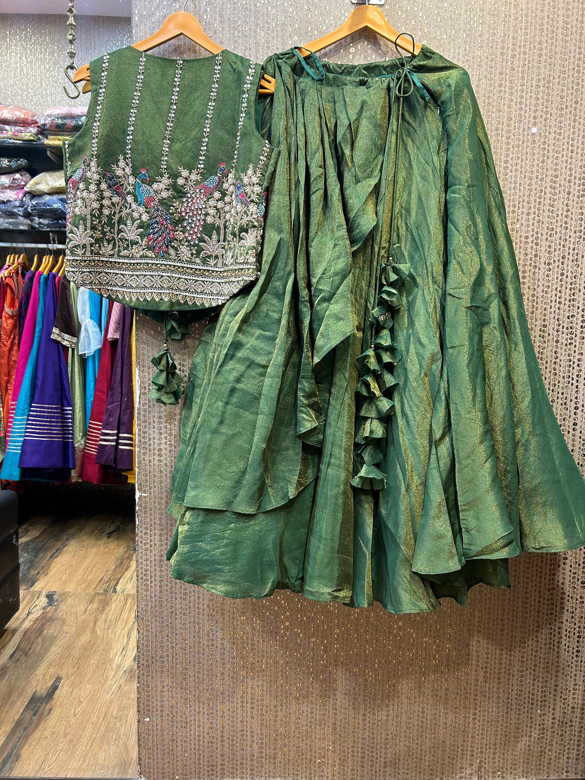 The centerpiece of this outfit is the luxurious tissue-based Chaniya, designed with an exquisite heavy flair. The shimmering texture of the tissue fabric adds a glamorous touch, while the intricate detailing elevates its aesthetic appeal. With its rich drape and striking design, this Chaniya exudes a regal charm, perfect for making a statement at grand events.