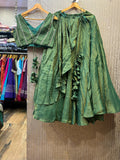 Complementing the Chaniya is a fancy spaghetti blouse that embodies contemporary elegance. The delicate straps give a sleek, minimalist vibe, while the fine craftsmanship ensures the blouse stands out as a statement piece. Its fitted silhouette perfectly balances the dramatic flair of the Chaniya, creating a cohesive and modern look.