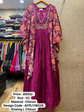 The focal point of this outfit is the beautifully crafted chinon fancy gown, designed to exude sophistication and grace. Made from high-quality chinon fabric, the gown drapes effortlessly, offering a flattering silhouette that enhances the wearer’s natural form. The fabric’s soft, flowing texture adds an ethereal quality, creating a sense of fluidity with every movement. The gown is adorned with delicate embellishments and intricate detailing that bring out its opulent charm, making it ideal for both formal and semi-formal occasions.