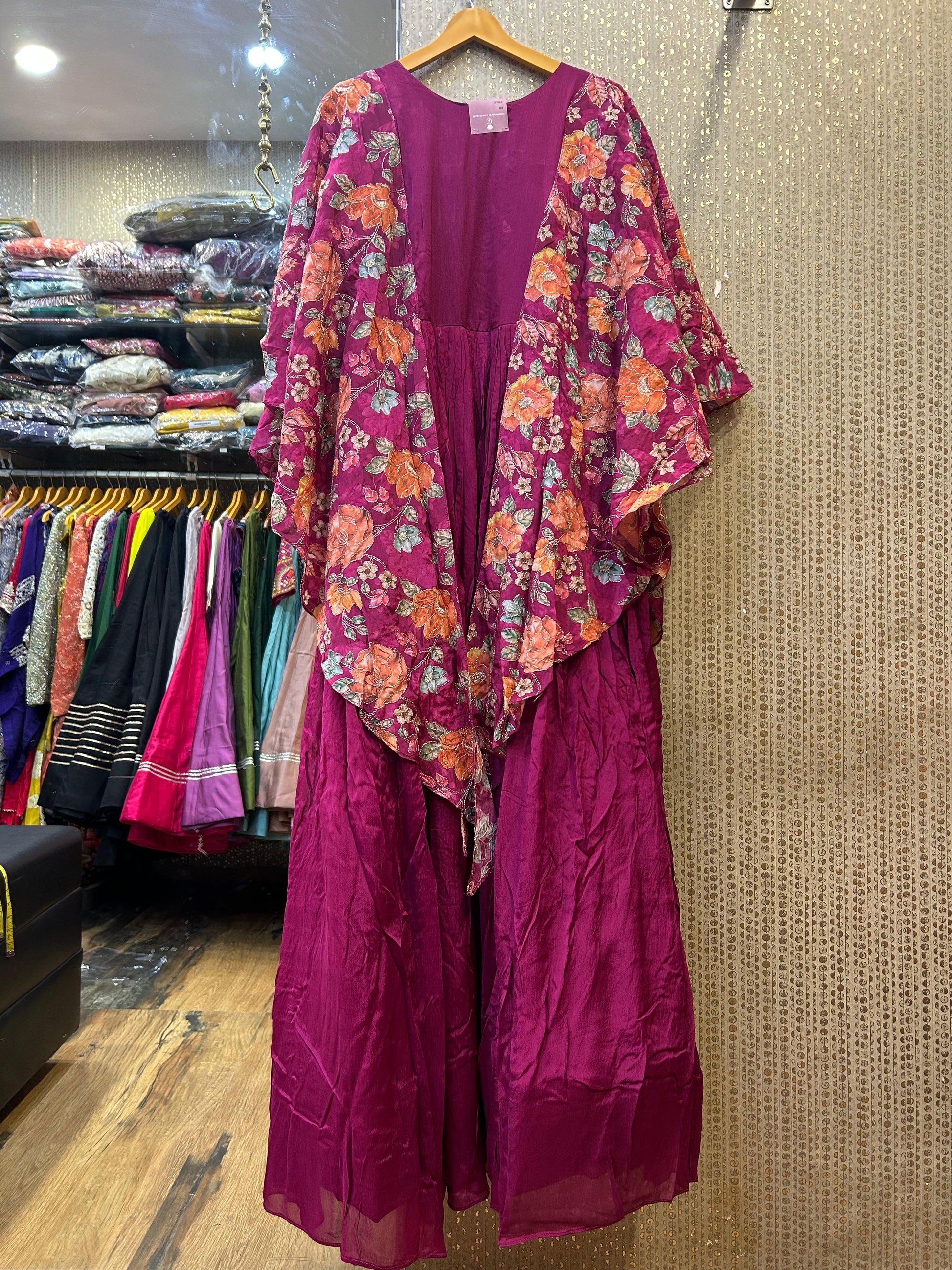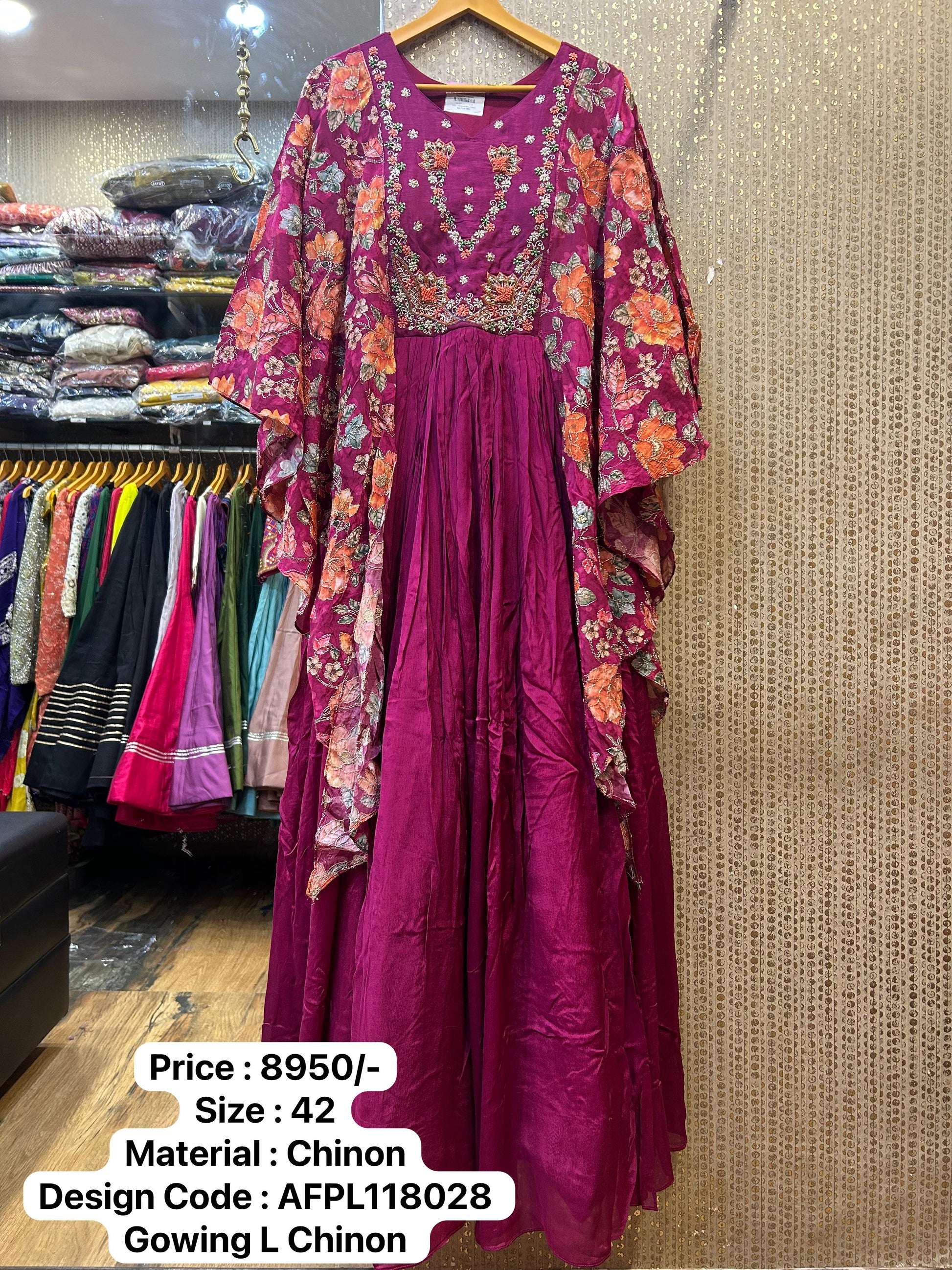 Kalpana’s Creations presents a stunning DESIGNER chinon fancy gown, a true masterpiece that seamlessly blends modern chic elegance with a touch of traditional charm.