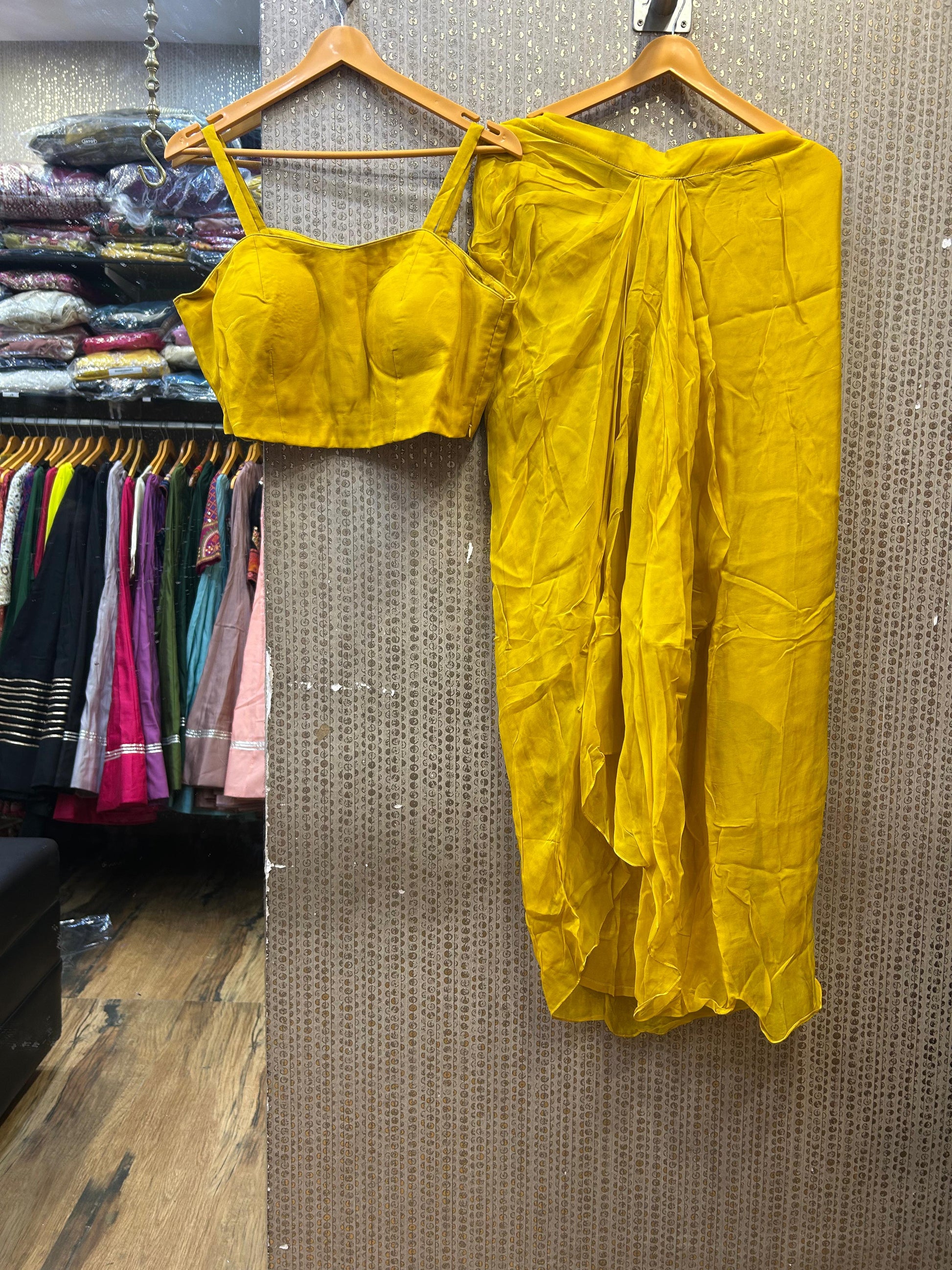 The fancy spaghetti blouse elevates the look with its sleek, modern design. Featuring intricate detailing and a flattering fit, this blouse is both stylish and versatile. The spaghetti straps bring a minimalist touch, perfectly complementing the draped dhoti for a balanced, chic appearance.
