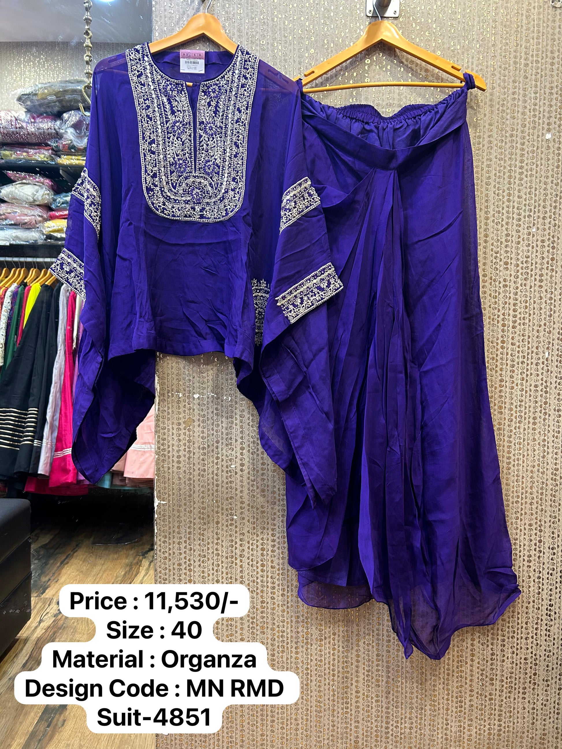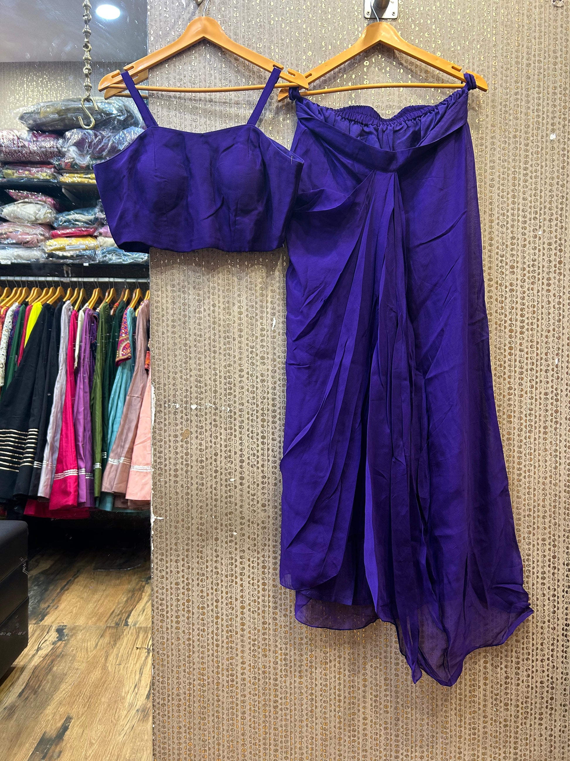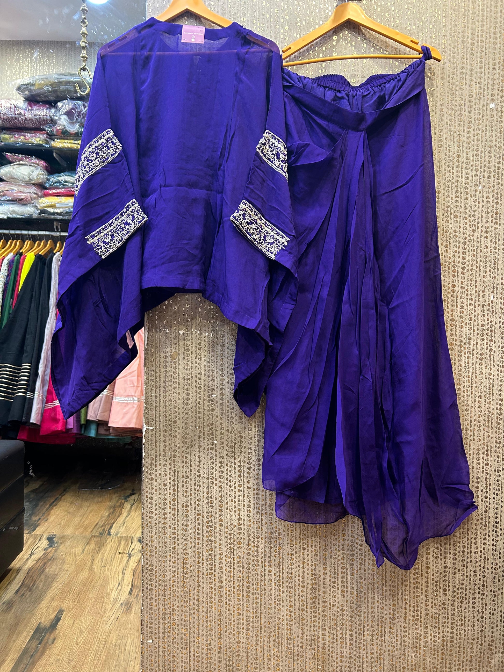 Kalpana’s Creations introduces a stunning DESIGNER ensemble featuring an organza heavy kaftan, a fancy spaghetti blouse, and a cowl-style dhoti, exuding a modern chic look perfect for upscale occasions.