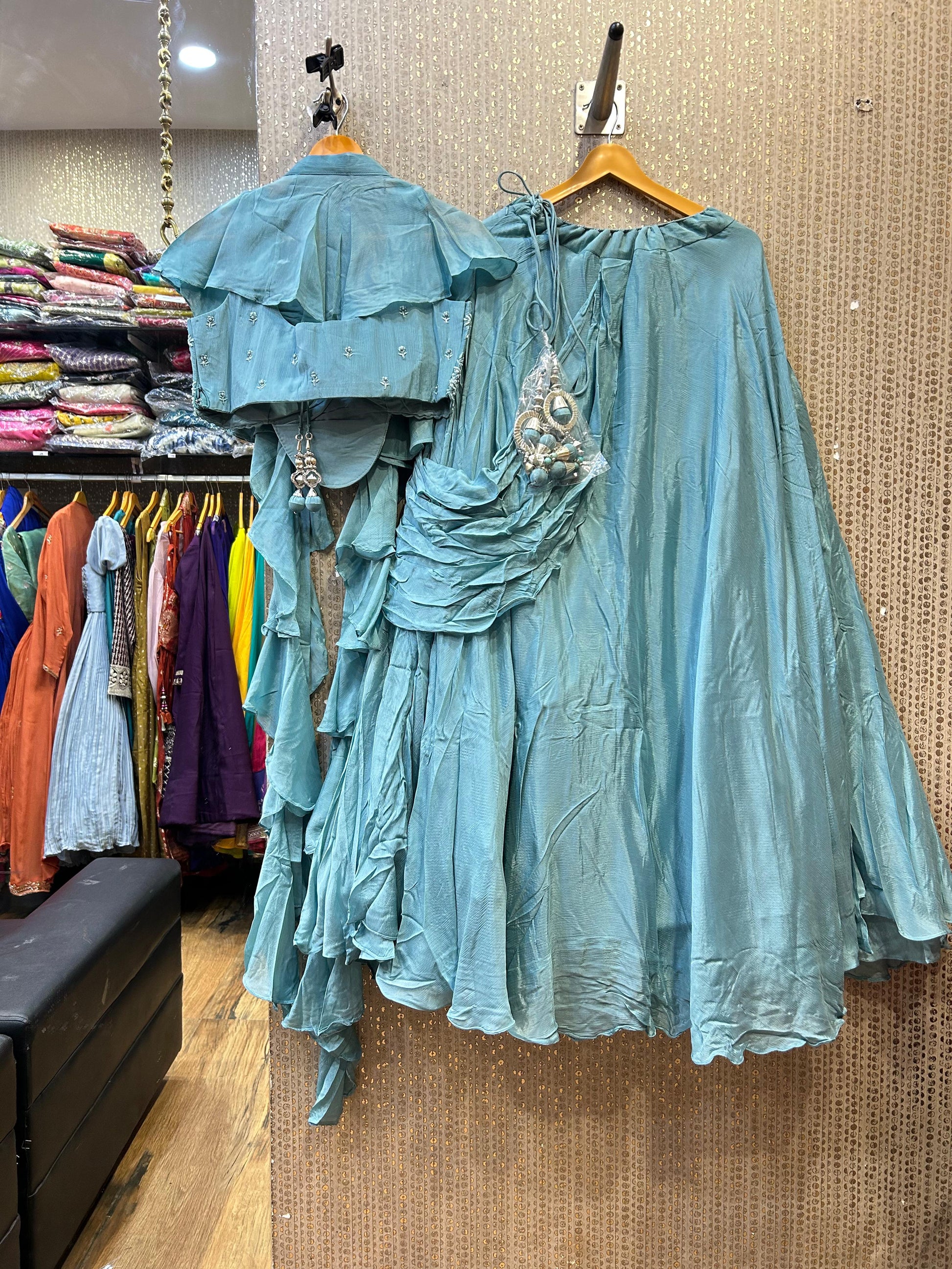 Kalpana’s Creations presents a stunning DESIGNER ensemble featuring a Chinon Chaniya, a handwork blouse, and a ruffle dupatta, blending timeless elegance with a modern chic appeal.