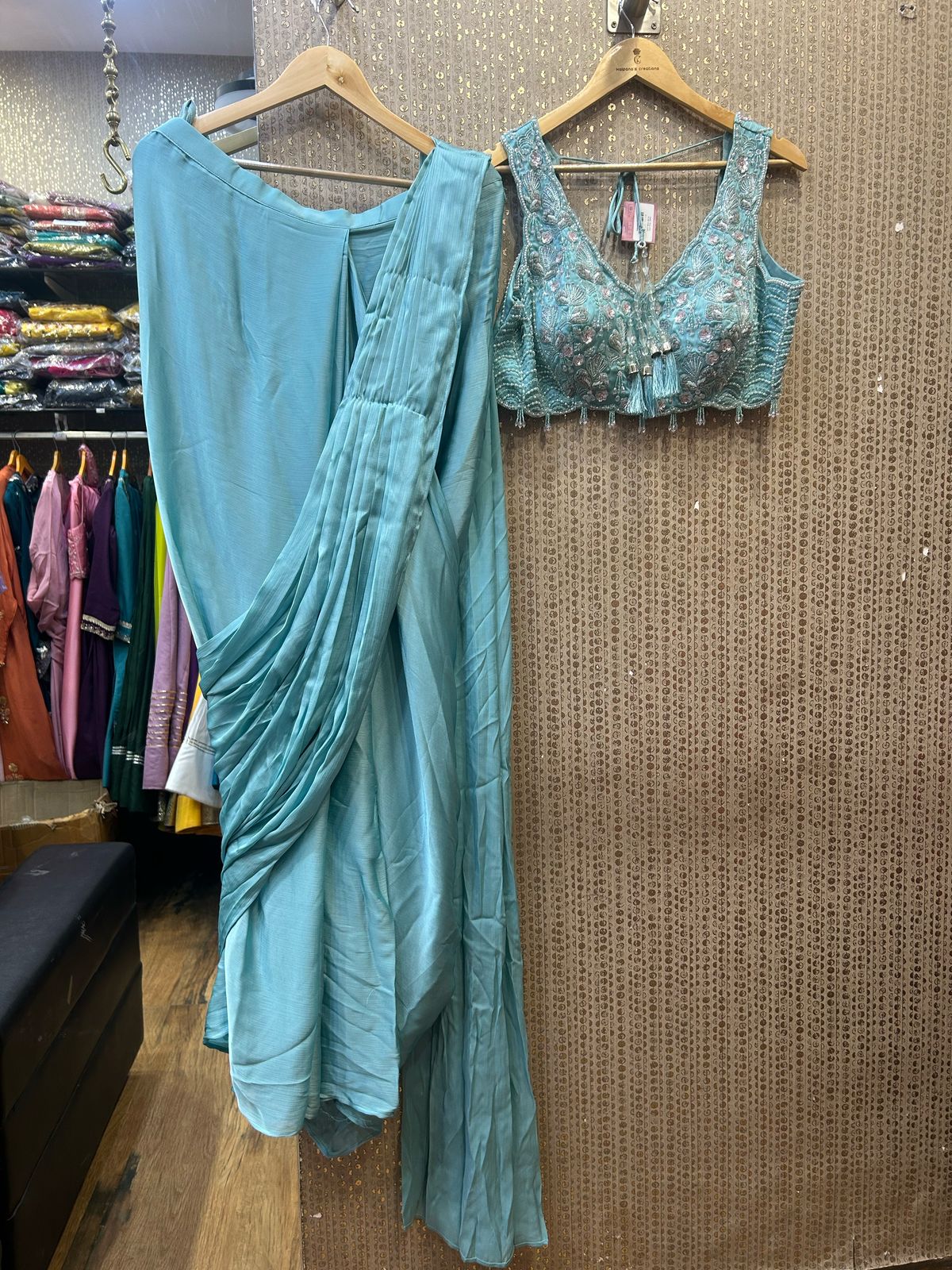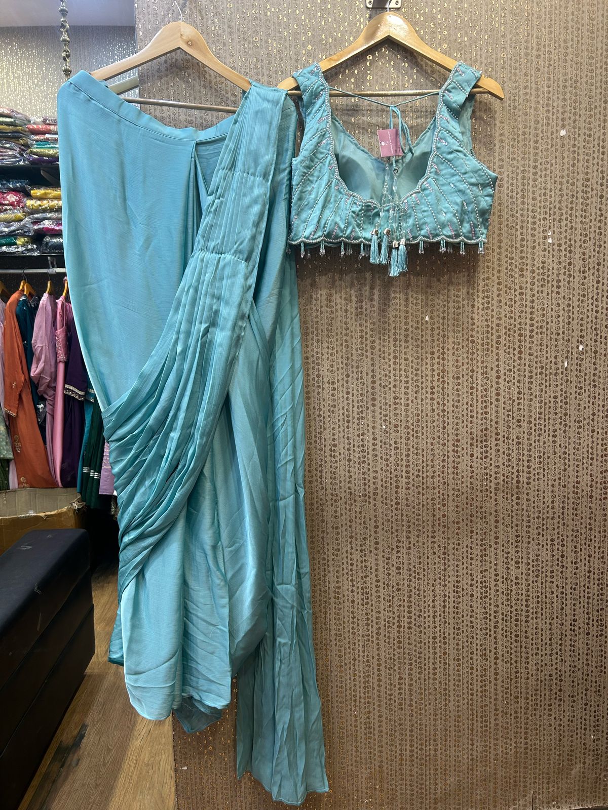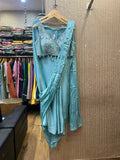 Crafted from luxurious silk, this drape-style saree flows with a soft, graceful drape that enhances movement. The fluidity of silk adds a regal touch, while the modern drape style ensures a bold and fashion-forward silhouette.