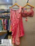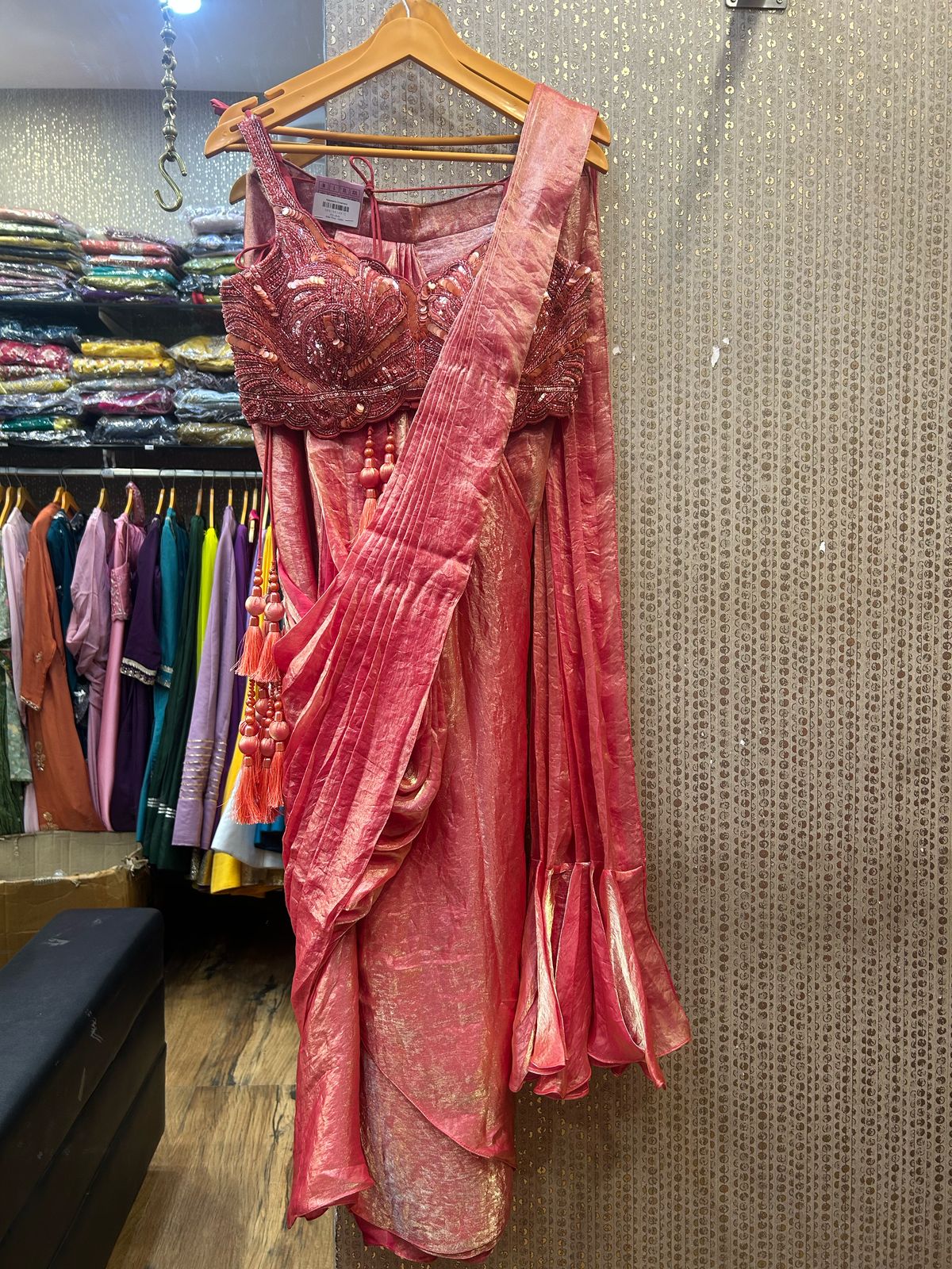 Crafted from luxurious glass tissue fabric, this drape saree shimmers with a delicate translucence, creating an enchanting, weightless flow. The fabric’s subtle shine enhances its ethereal appeal, making it a perfect choice for elegant soirées and high-fashion celebrations.