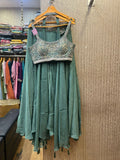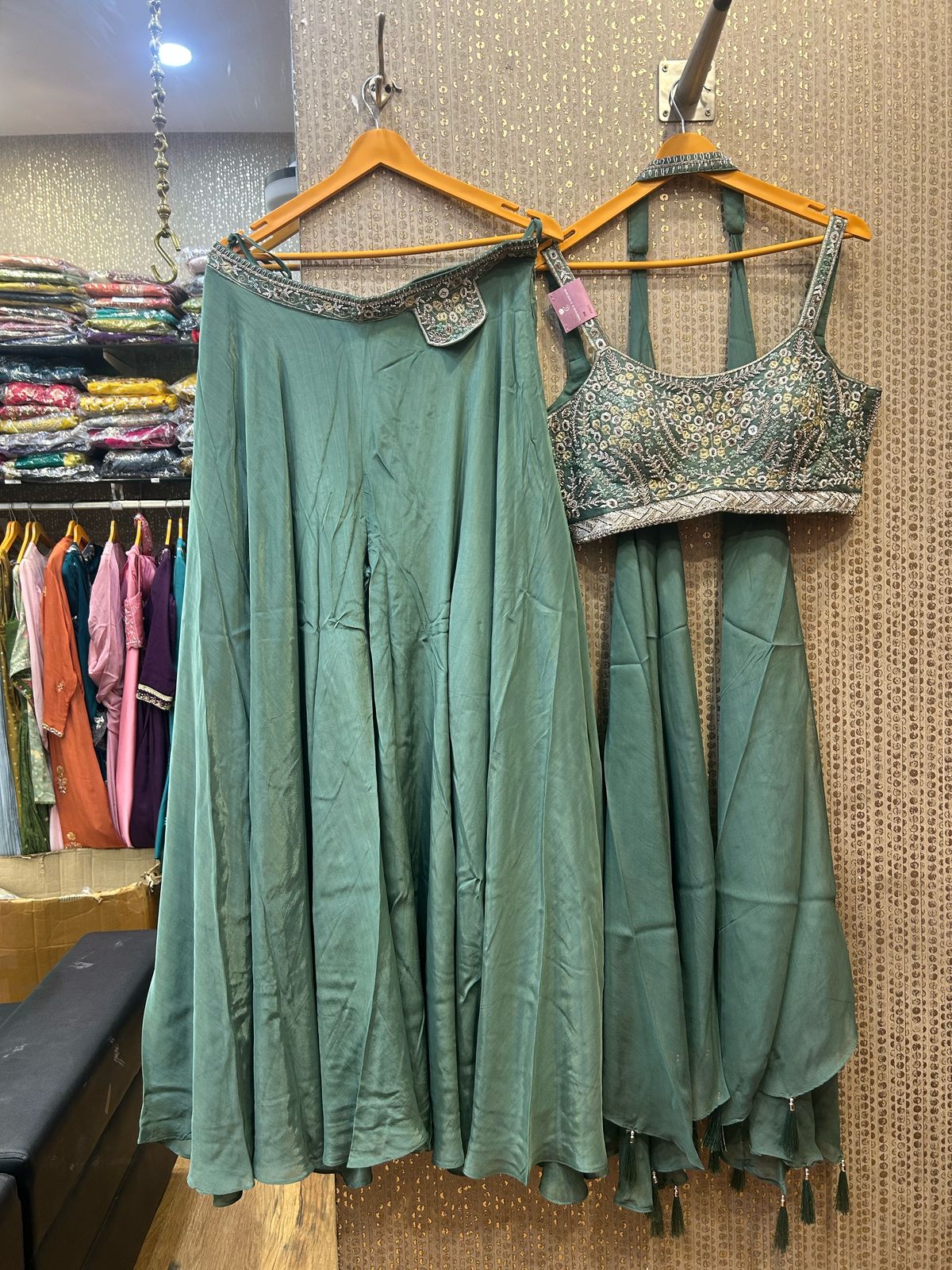 Kalpana’s Creations presents a dESIGNER Silk Pazzo ensemble, featuring a sleek spaghetti blouse and a choker-styled dupatta, redefining elegance with a modern chic look.