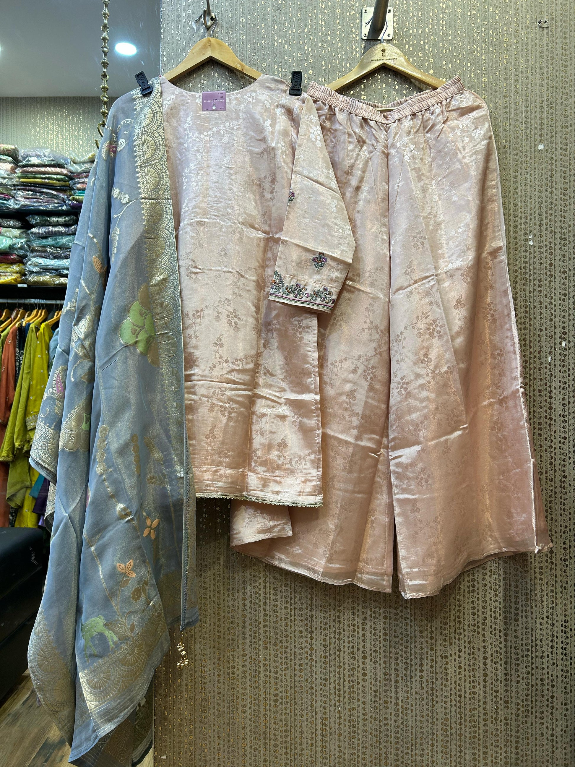 Kalpana’s Creations presents a dESIGNER Tissue Silk Dress, adorned with heavy handwork, paired with a fancy pant and a Banarasi weaving dupatta, creating a modern chic look that blends elegance with tradition.