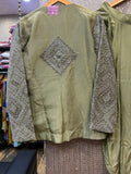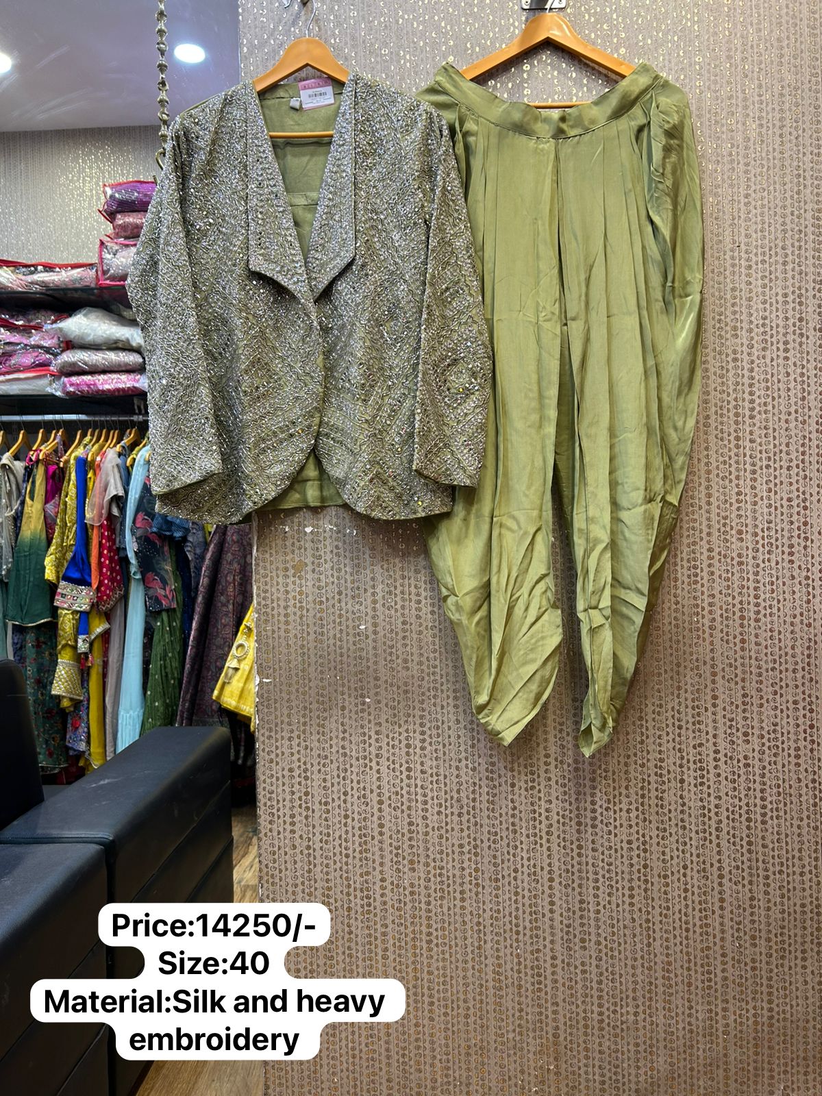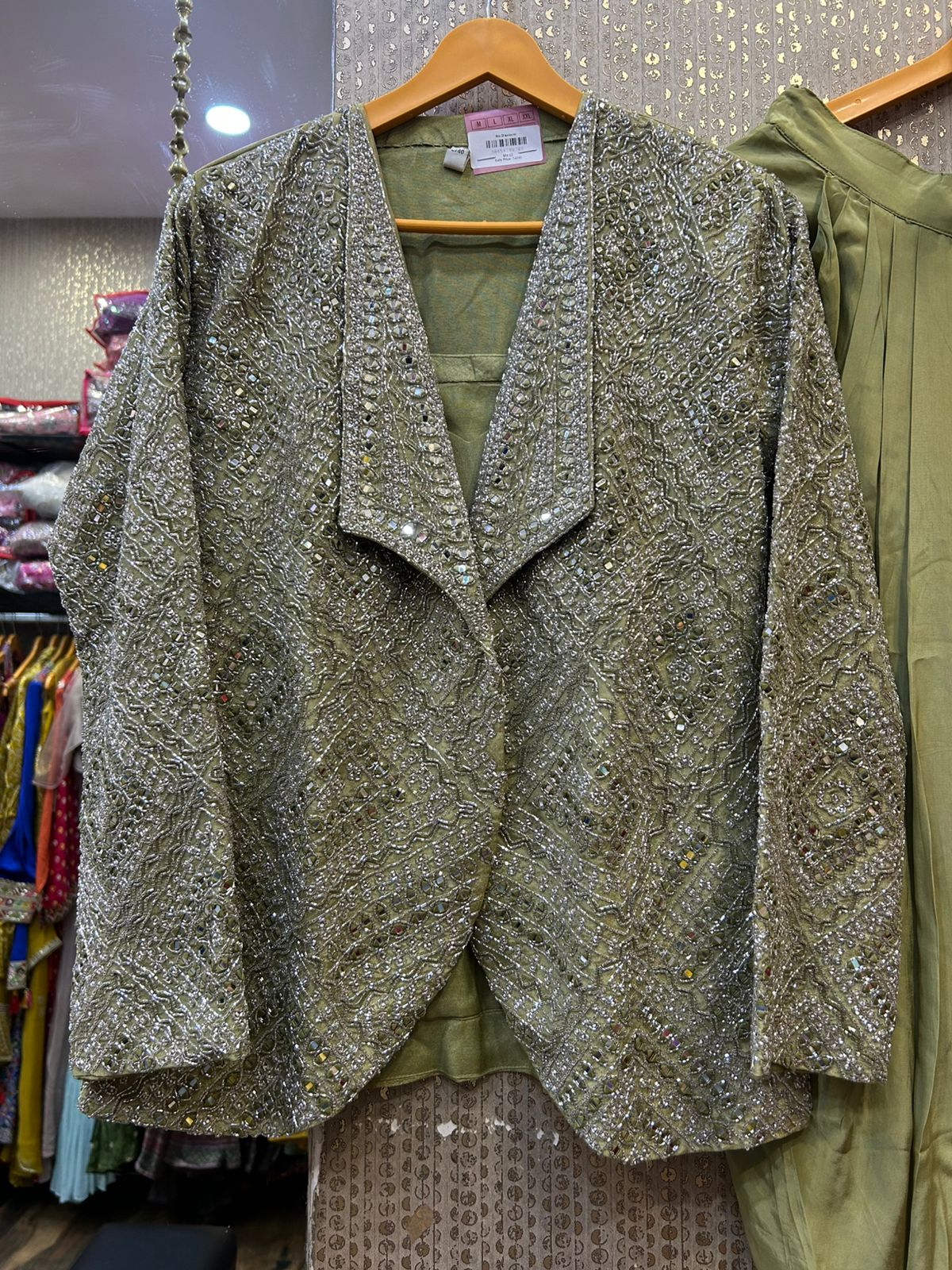 The centerpiece of this ensemble is the intricately designed blazer, featuring stunning heavy handwork. The blazer is adorned with detailed embroidery, embellishments, and intricate patterns that bring a luxurious feel to the look. The structured silhouette of the blazer creates a sleek, modern aesthetic while its embellishments provide a rich, traditional touch. With its sharp cuts, tailored fit, and ornate details, this blazer is a statement piece that exudes both power and elegance, perfect for making a bold impression at any event.